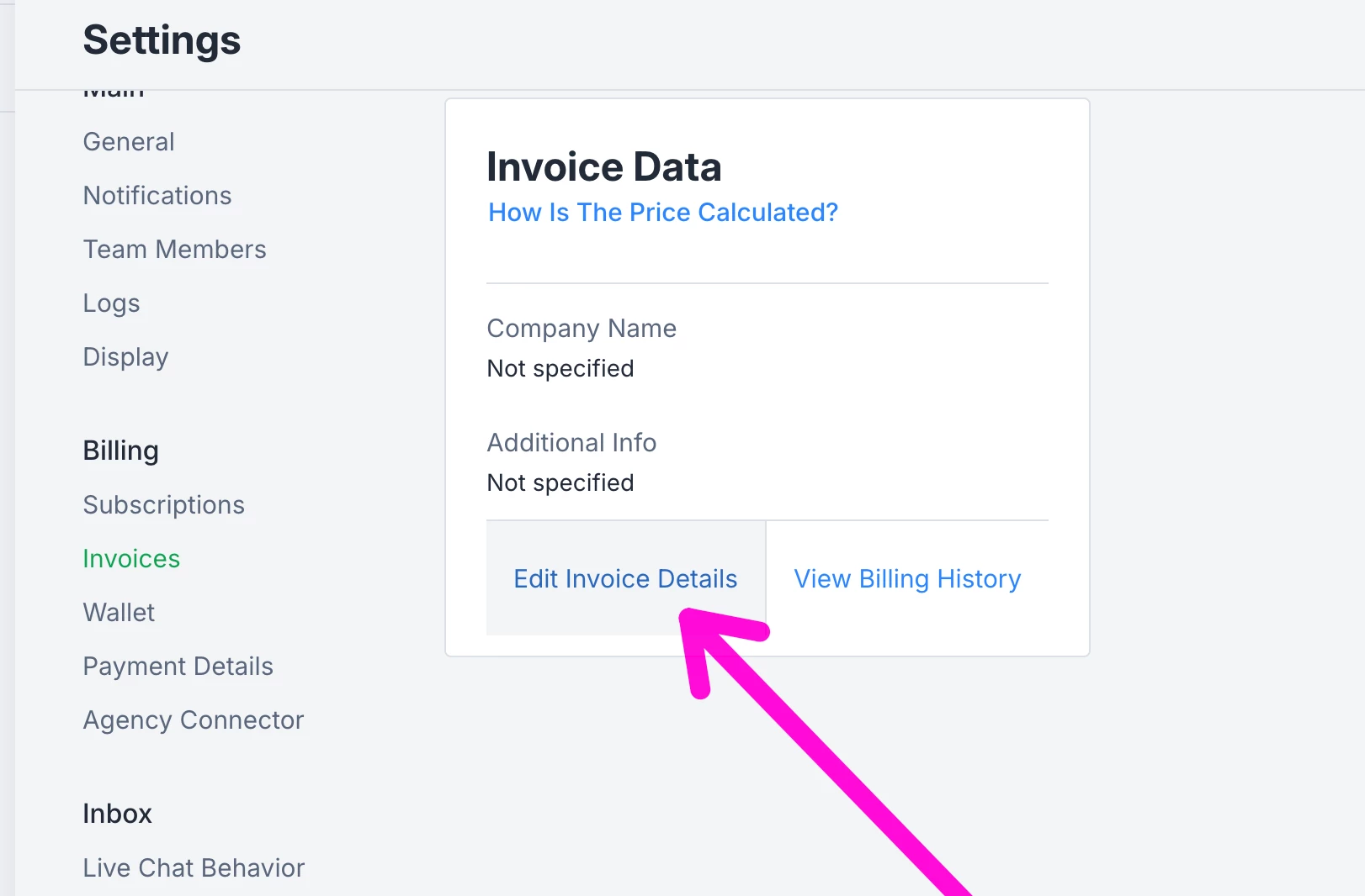 Preciso de adicionar o meu NIF (Número de Identificação Fiscal) às faturas da minha conta ManyChat, mas o campo “VAT / Tax ID” não aparece nas definições de faturação.