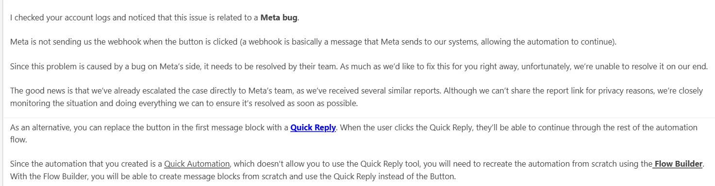 But since 2 days, people NEVER receive my 2nd message when they click on the button.