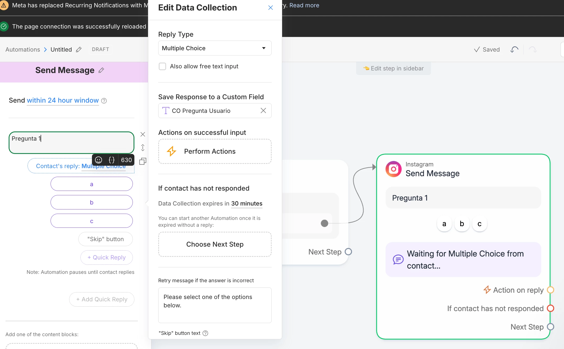 Hola, estoy queriendo hacer una personalización para una conversación iniciada luego de comentario en post o reel, la idea es hacer una encuesta desde many chat y no de forms de google, pero se me complica, llega cortada la conversación o me dispara mal los mensajes, si alguno me puede ayudar..