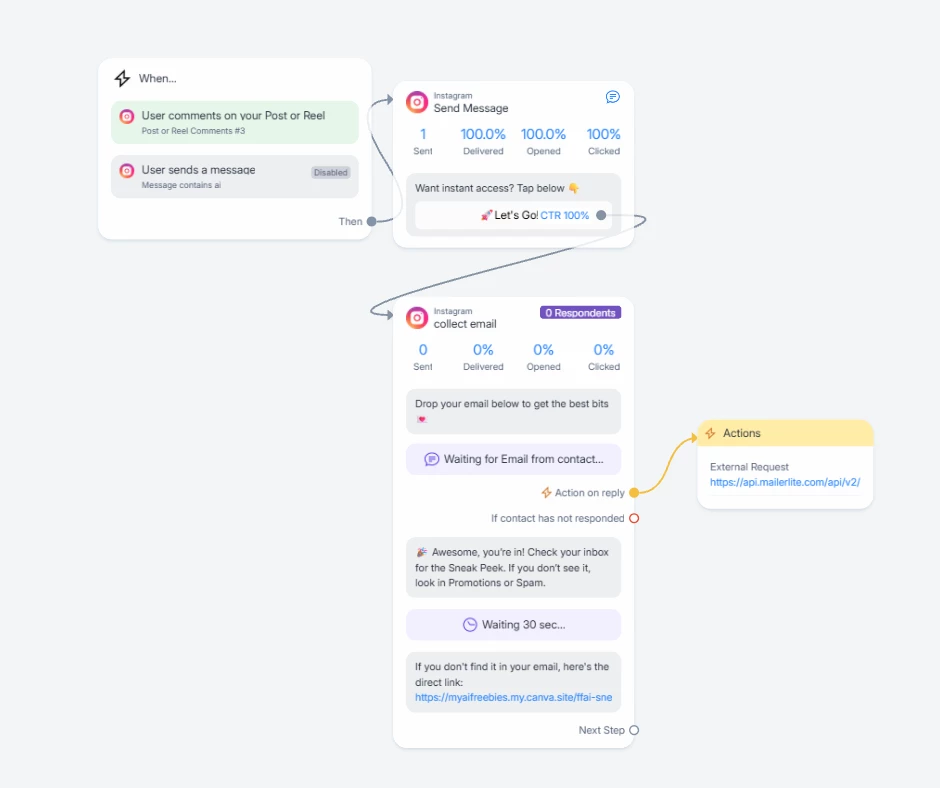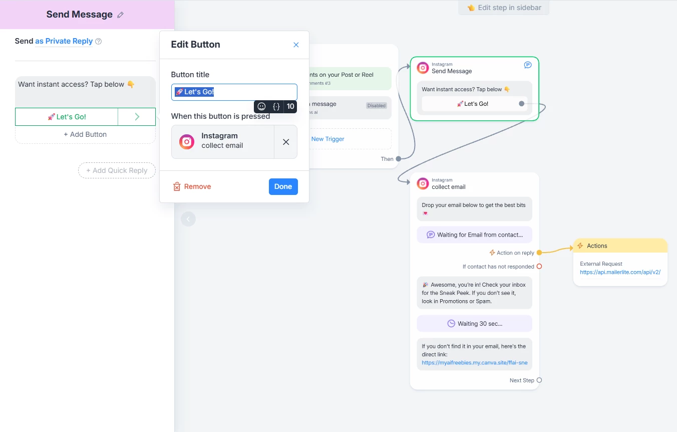 I’ve searched posts on here and have not found the issue I am experiencing. I have a trigger set up to send a reply as private with a button to press that gives permission to continue. I’m using an Android phone to test. I comment on an IG account with the trigger word. The message comes back to my DM displaying the button just fine. Pressing the button just echoes back and does not continue the automation. I have tried with a direct button and as a quick reply. I’ve gone through all the troubleshooting, permissions, refreshing connections, removing MC and re-adding.