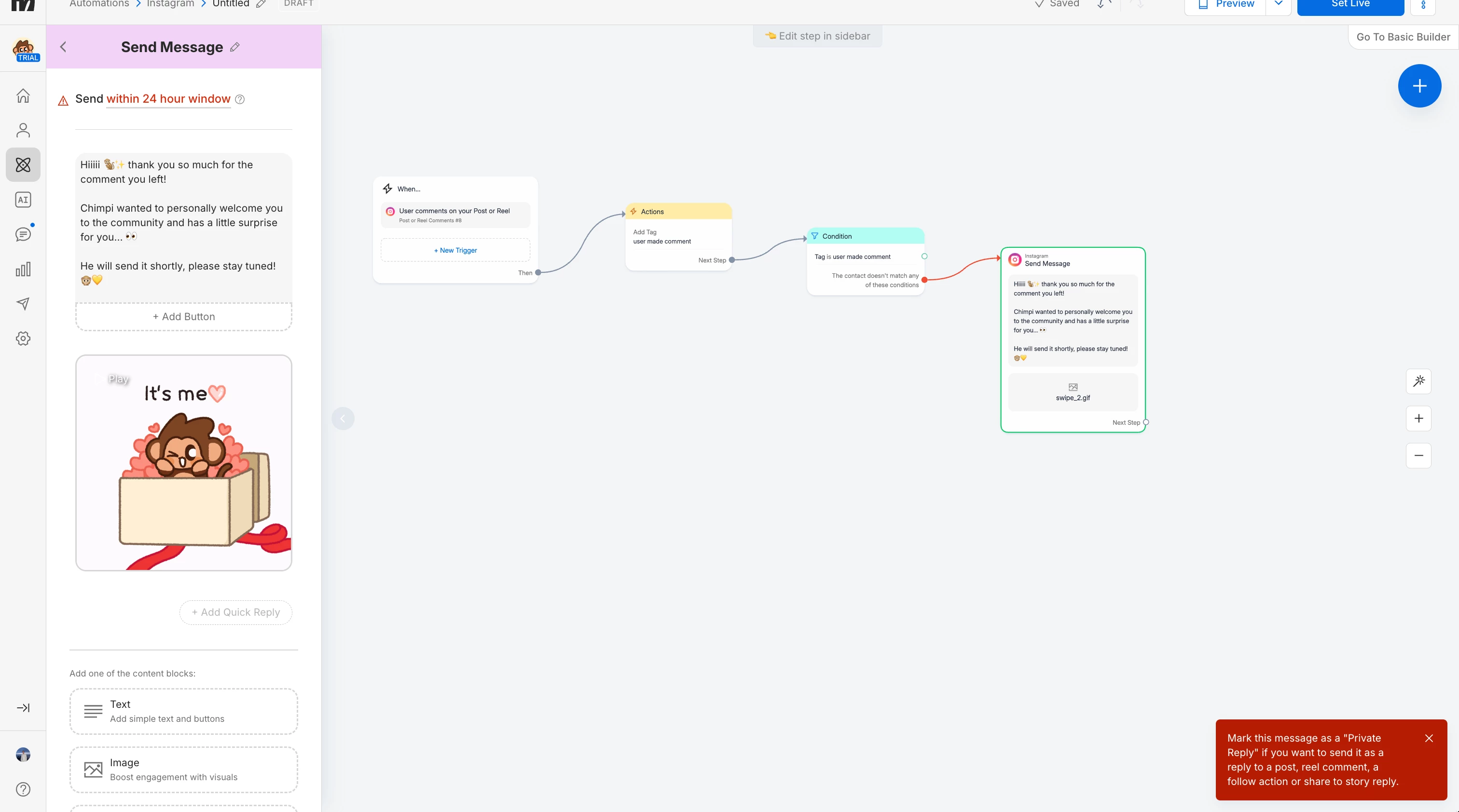 @Chimpers on the top left hand side where it says ‘within 24 hrs’ in red. Click on that and change it to private reply. Any first message sent via post/reel or IG live has to be marked as private reply. It’s a Meta compliance thing.