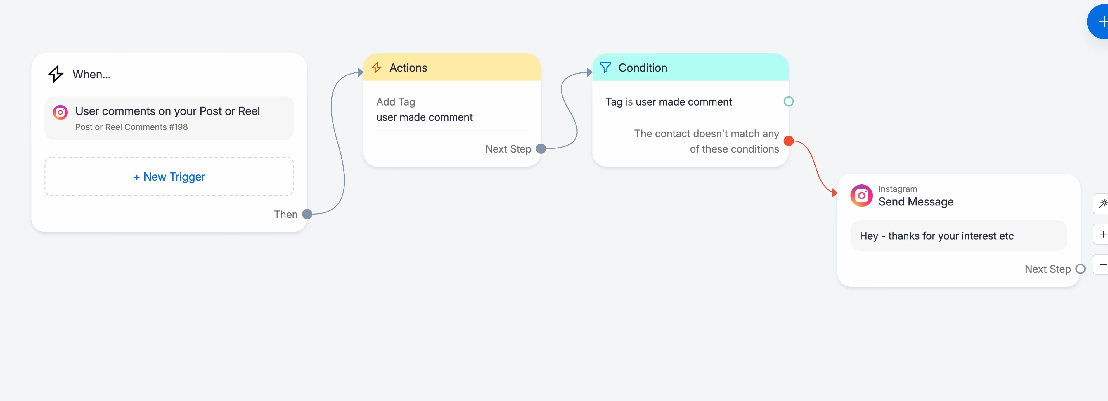 This will filter out those who have commented before and nothing more will happen, but those who haven’t commented, (the red line), will receive your Welcome message. Beware though of two things: firstly once this is live, it will only tag going forward, not anyone who has commented historically, and secondly, users may not be expecting a DM from you just from their comment (unless this is made obvious in the content) so it ‘could’ add a little friction (but much less from them receiving a DM from every comment!)