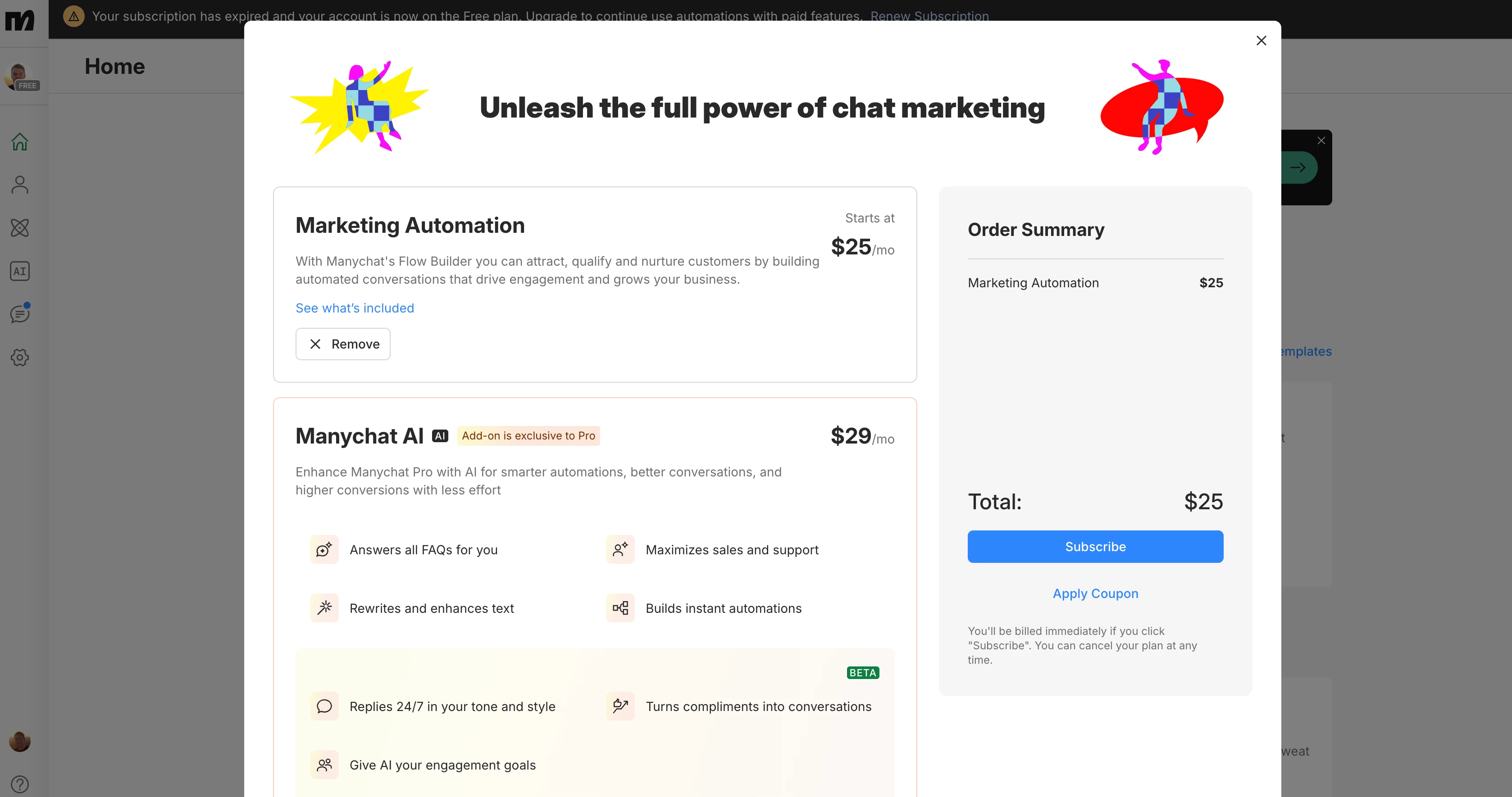The pricing page says Pro is $15, but when I click “Become pro”, I’m led to my dashboard with only a “Renew subscription” link at the top. When I click that, there is a $25 item in my cart called Marketing Automation with no mention of the Pro plan on the page.