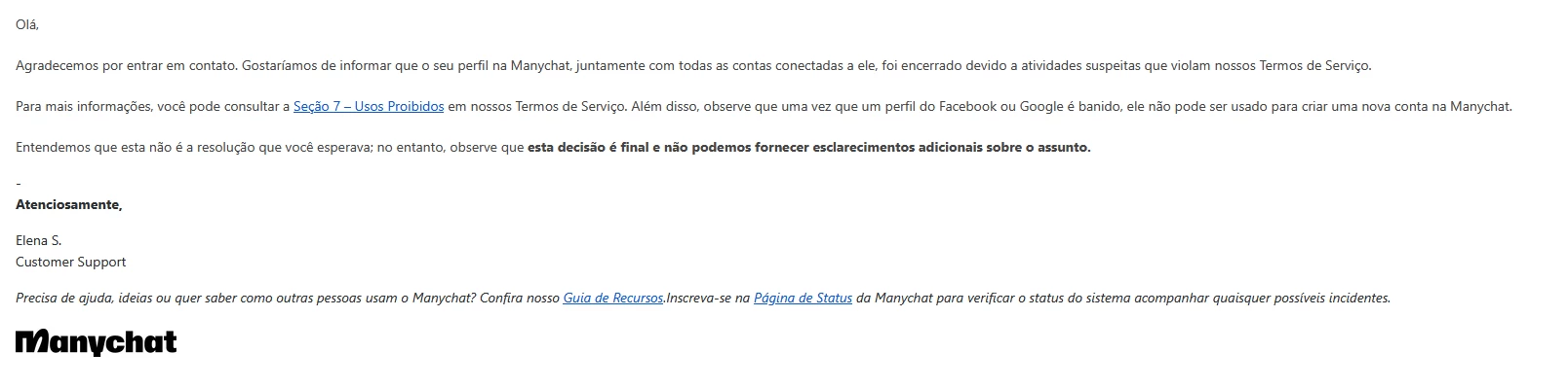 Minha conta foi encerrada com essas informações. Ao verificar a seção 7. Usos Proibidos eu não encontrei nada que possa ter feito que tenha encerrado a conta ou que tenha quebrado alguma regra ou politica. Isso me deixa frustrado.