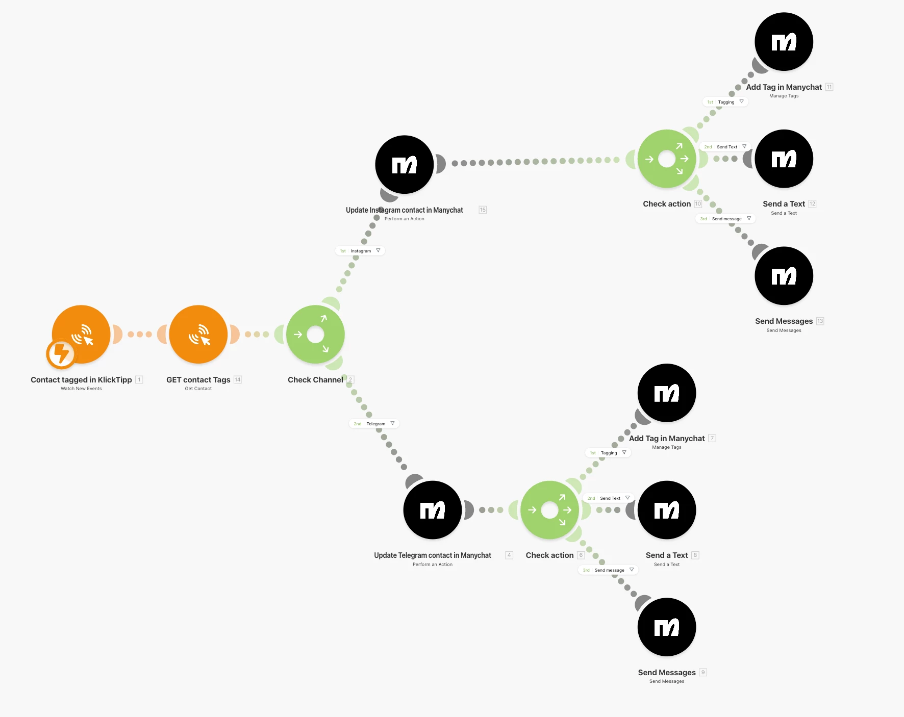I assumed you can use the modules “send text/message” for any of the channels and that the subscriber ID would carry the attached channel so that Manychat know via which channel to send the message. Is this wrong and will Manychat always try to send out via Facebook in that case?