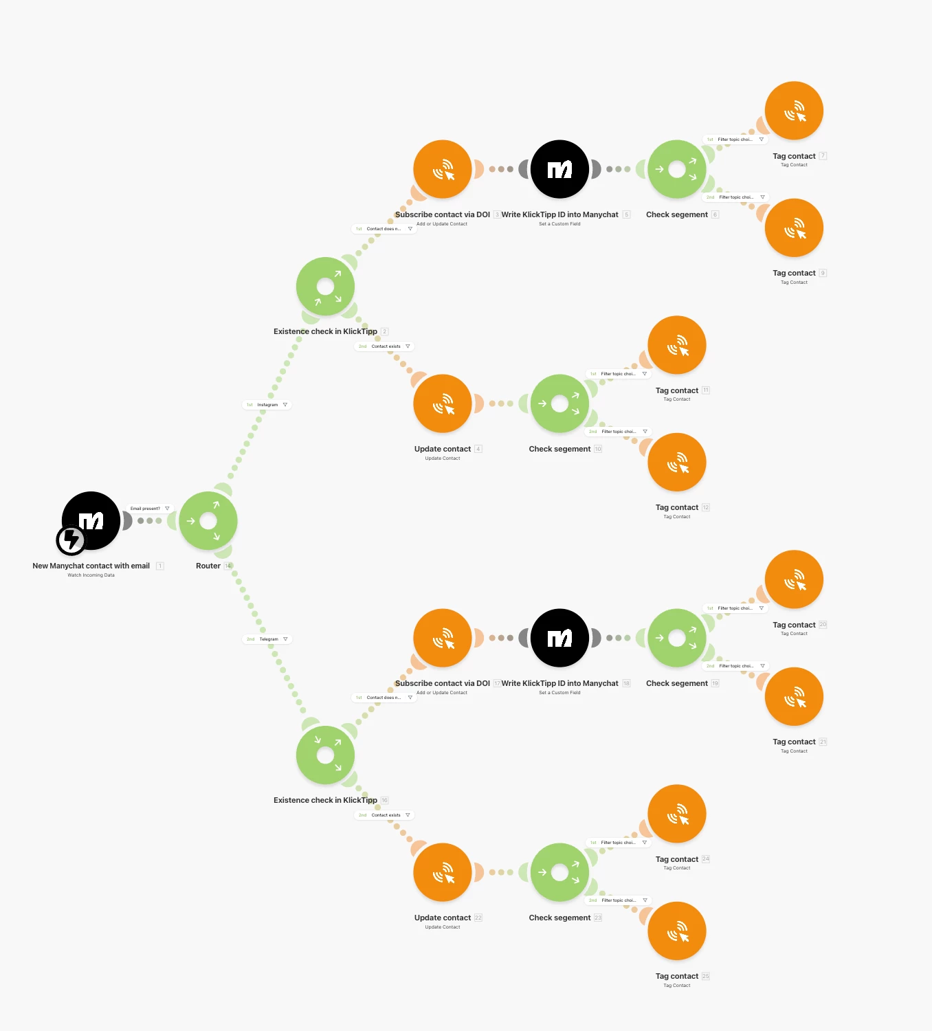 Interestingly if I only apply a Tag and then use an automation within Manychat to send out a message the Telegram and Instagram message arrives as expected.