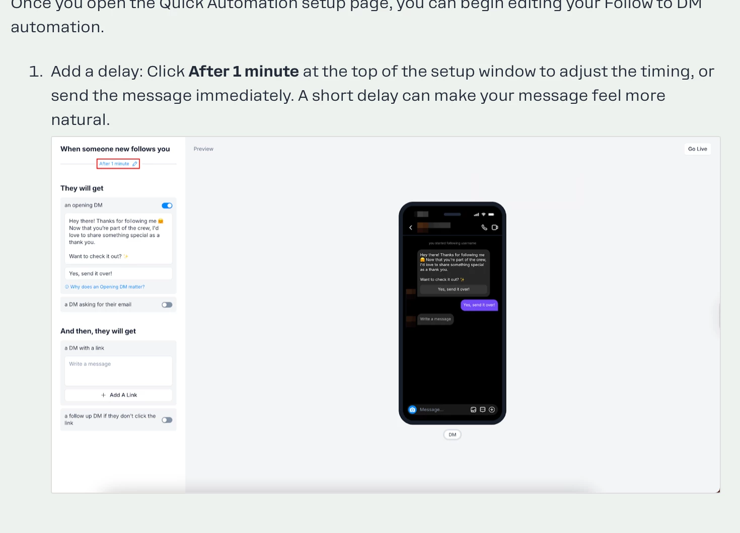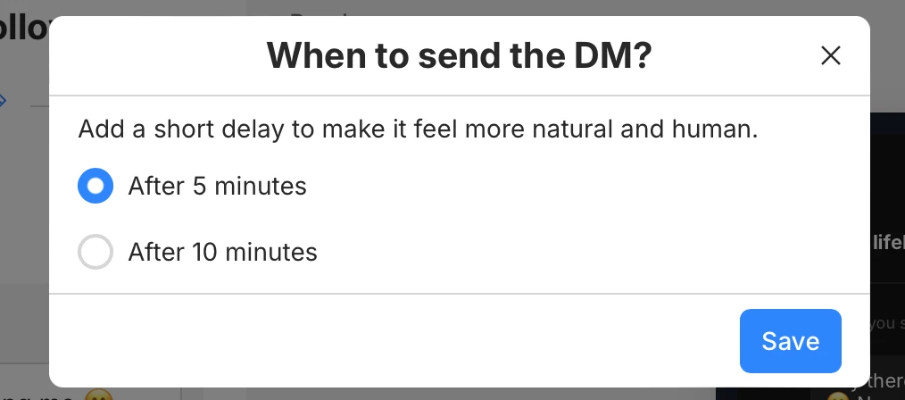 Excited to try the DM to new followers automation with my Pro account but my delay time options are only 5 minutes and 10 minutes which seem too long for my preference. In the step by step guide as well as YouTube videos I have seen that there are several other options available - no delay, 30 seconds, 1 minute. How do I gain access to those options? Thank you
