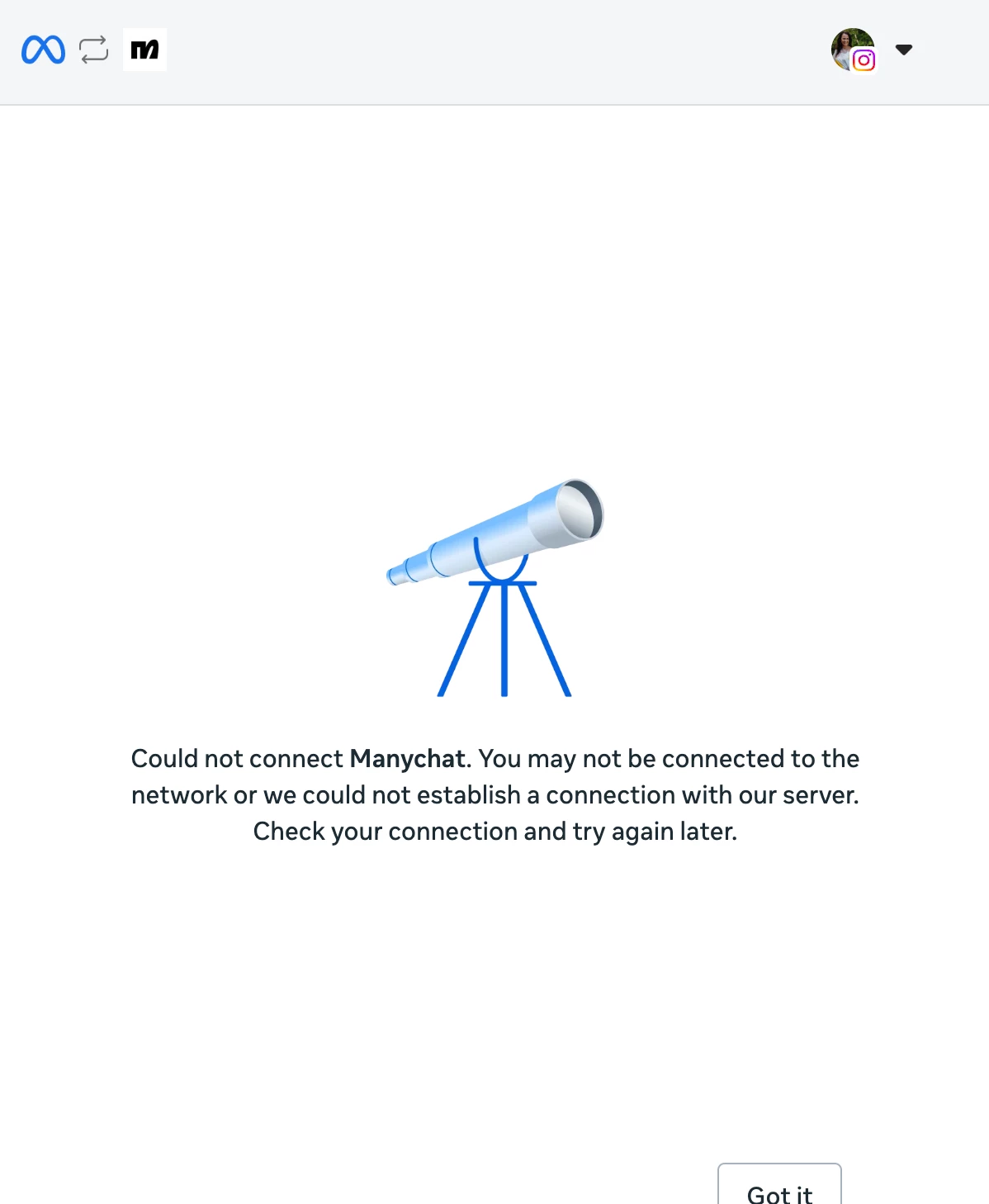 I registered to manychat and keep getting this error every time I tried to connect my IG Account. I chose the quick automation “Say hi to new followers”