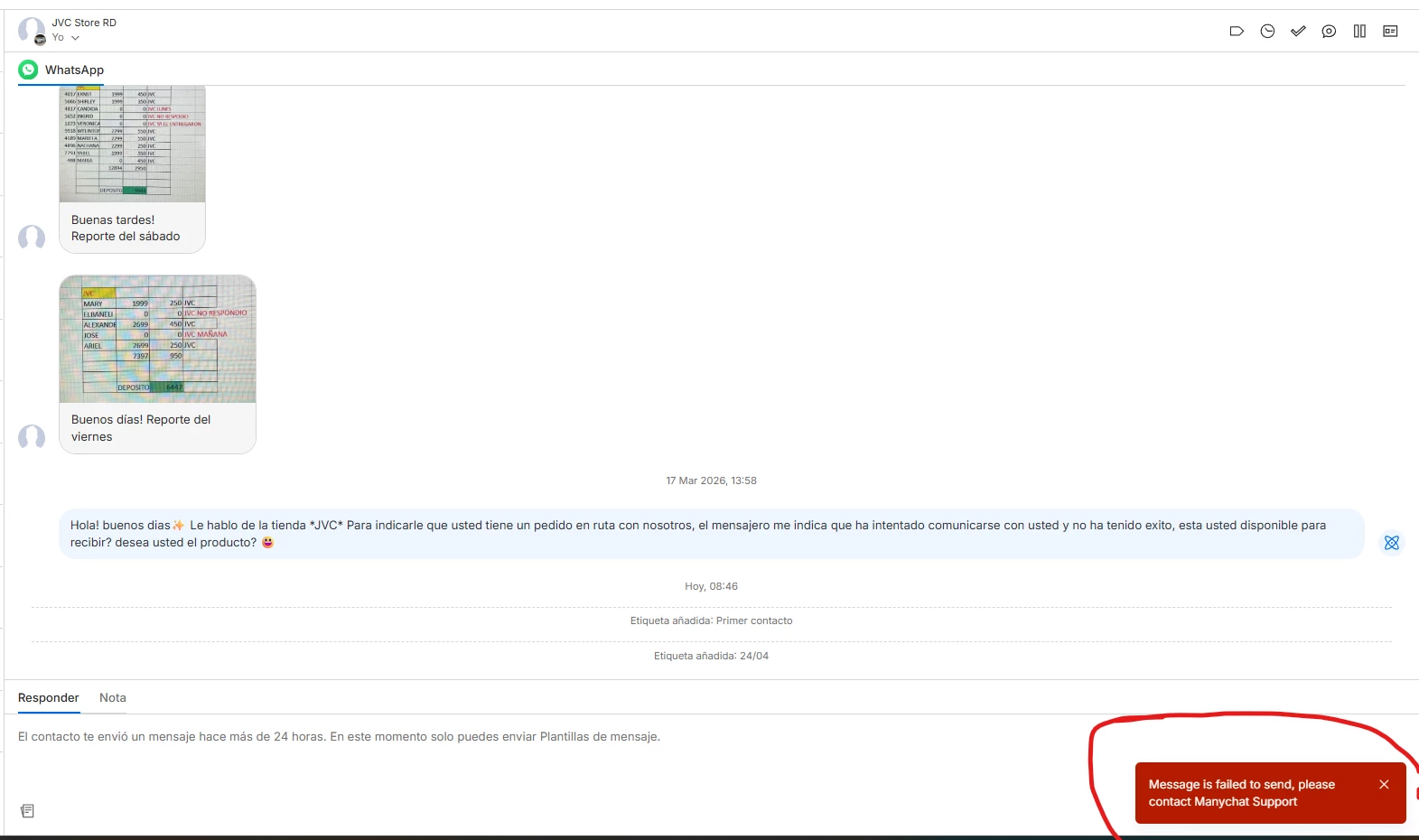 Every time I try to send a template, I get the red alert: "Message is failed to send, please contact Manychat Support".