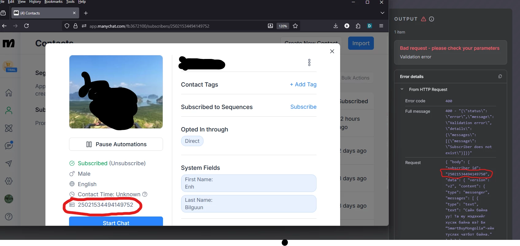 I confirmed that the subscriber_id (e.g. 25193238166929150) is coming from ManyChat’s webhook payload, but the API says the subscriber doesn’t exist.