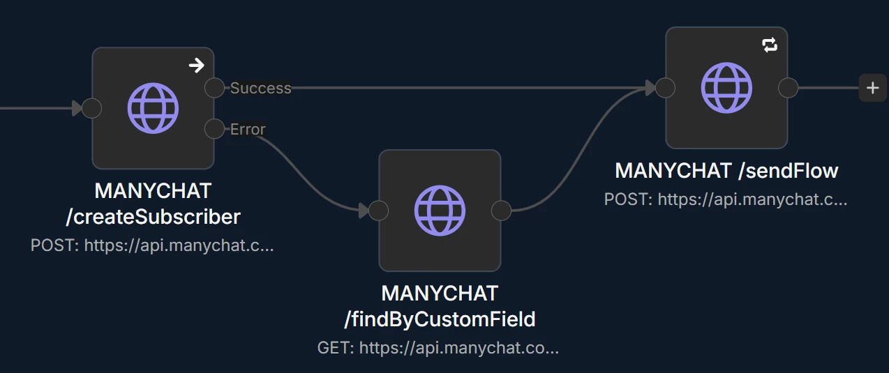 The /sendFlow endpoint needs the subscriber_id. To get it, you need to search for existing contacts before creating a new one (if the contact already exists, you get an error message). And the only way to get it done with a WhatsApp ID is creating a custom field and an extra automation that populates this field with the contact’s WhatsApp phone number. Then you use the /findByCustomField endpoint to get the subscriber_id if it already exists.
