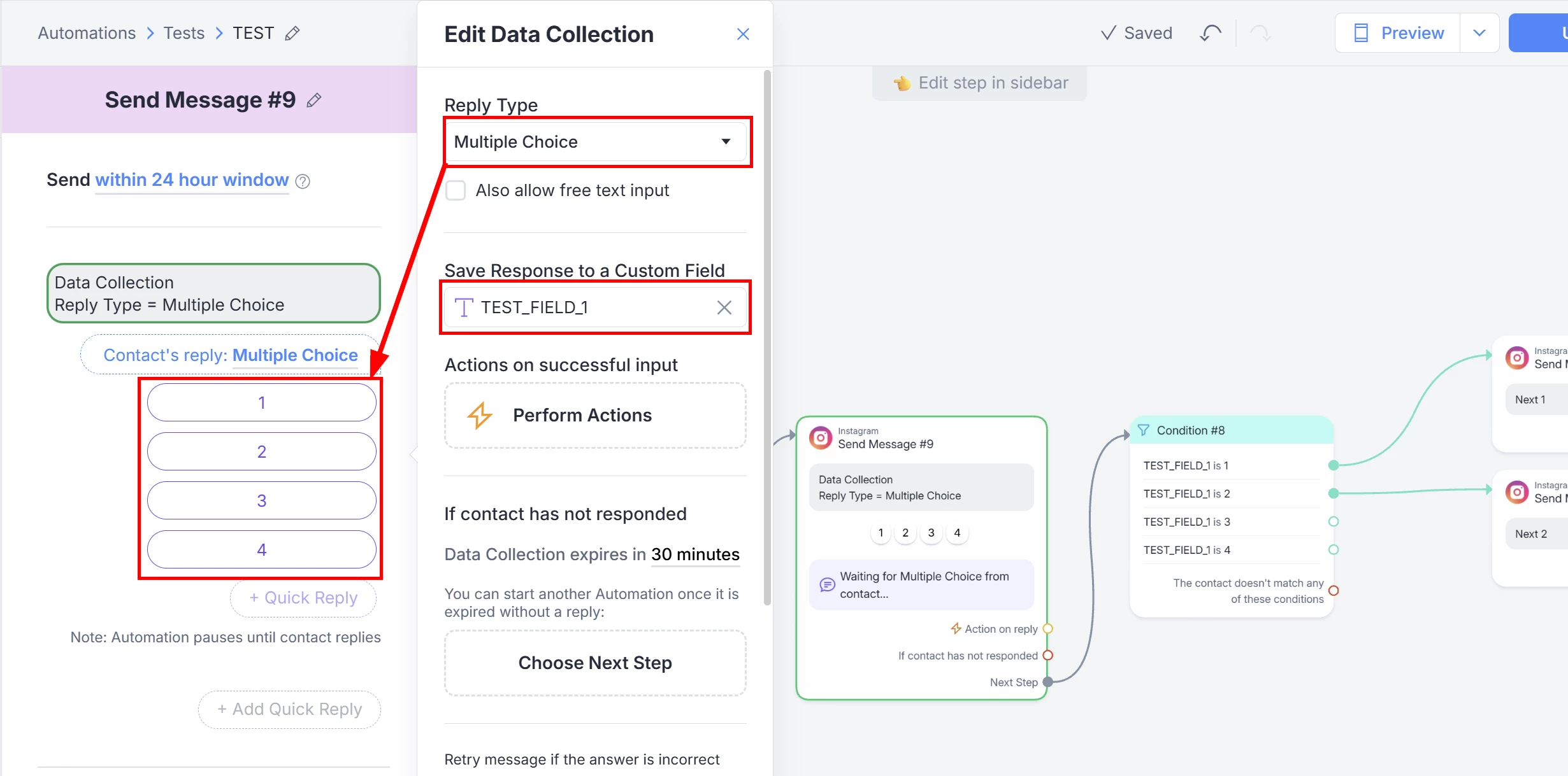 Now, as next step, set a Condition Block and create one condition for Every option you have defined in your Data Collection Quick Replies.