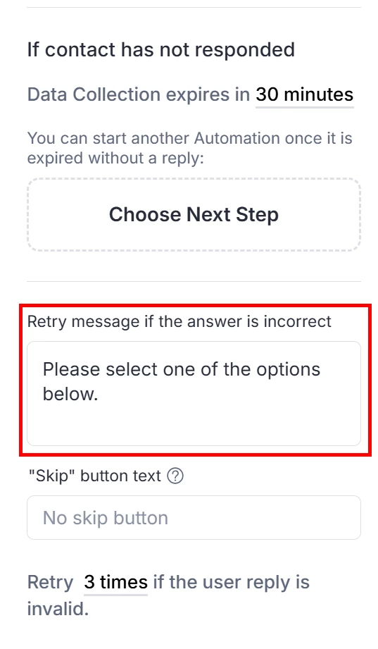 I can do this successfully by looping them back to the question using data collection or conditions with tags when they give an invalid response using the “next step” feature. However the “next step” runs in the background even after i get a valid response and will still loop them back to the question.