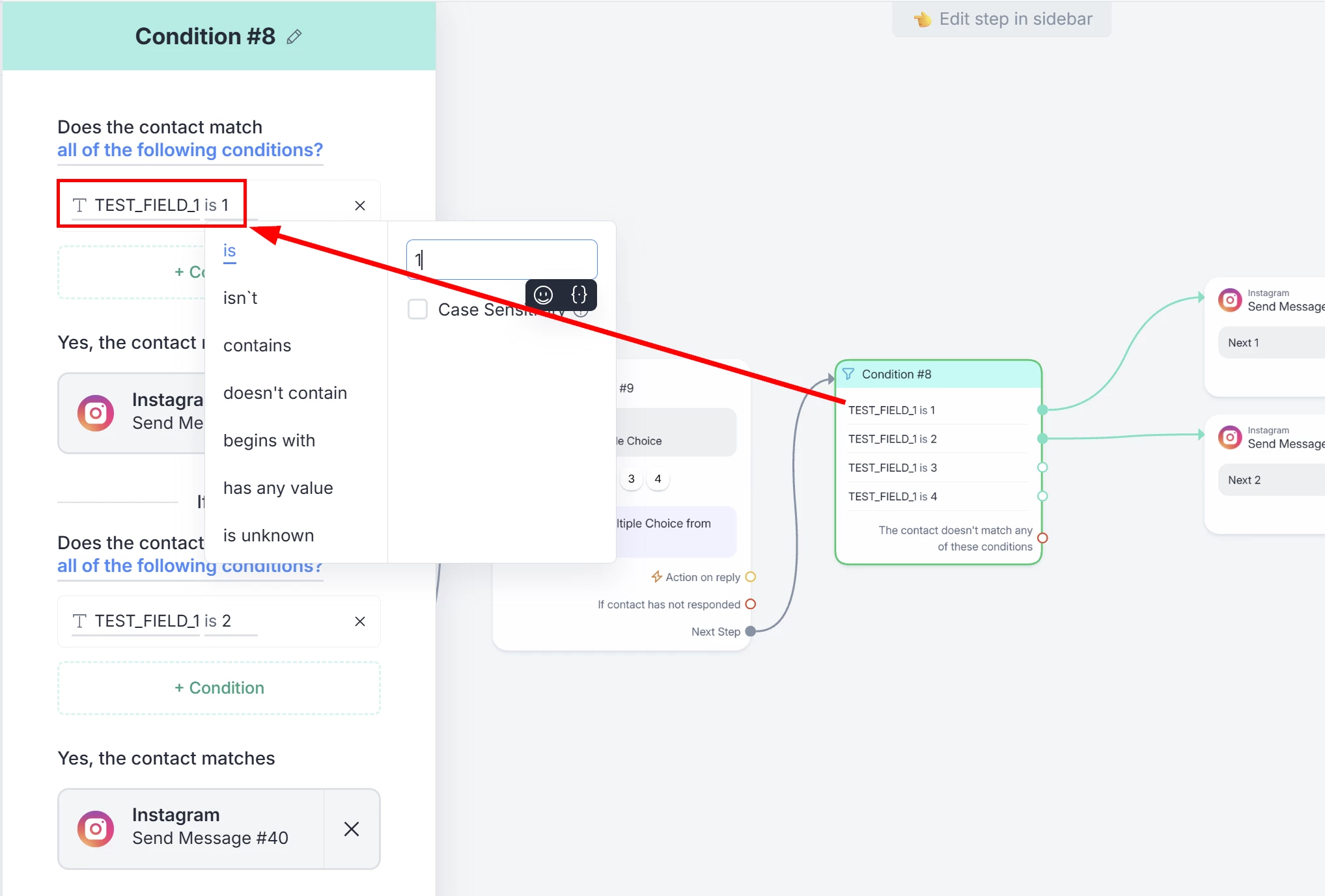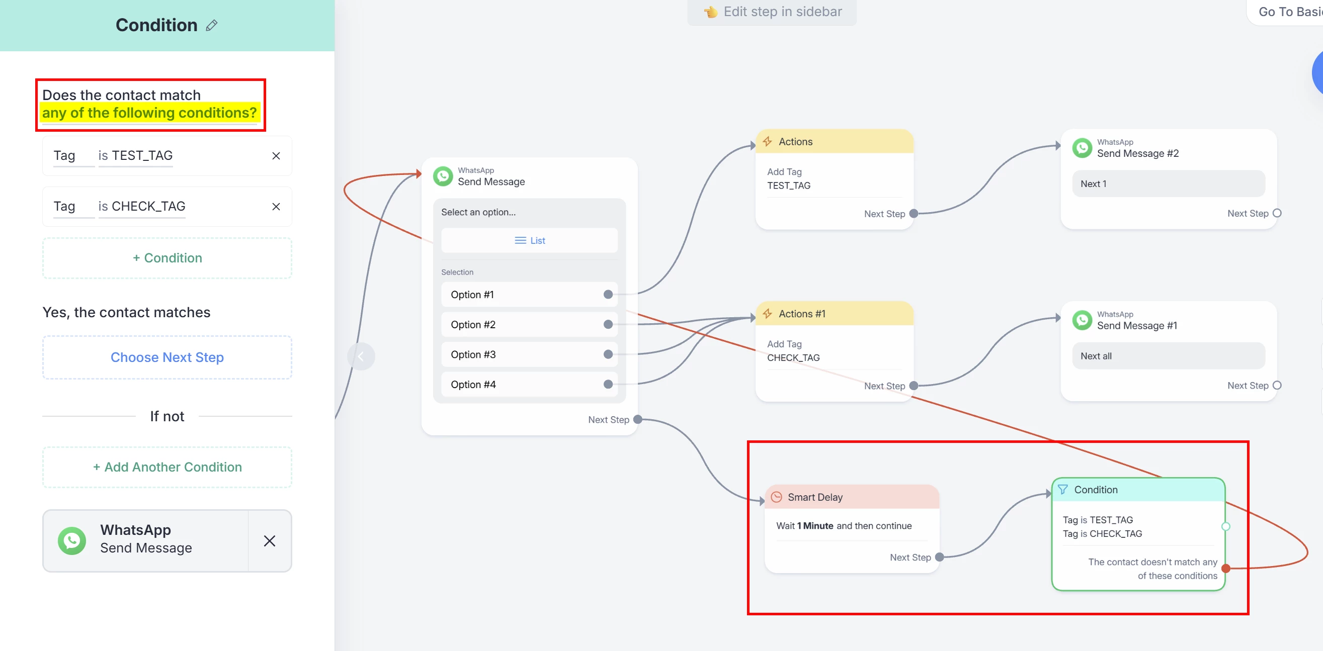 Now set a Condition step checking if the contact has any of the tags you set if he selects any list option. IMPORTANT: Change the matching to any of the following conditions, otherwise you’ll get an infinite loop 😅