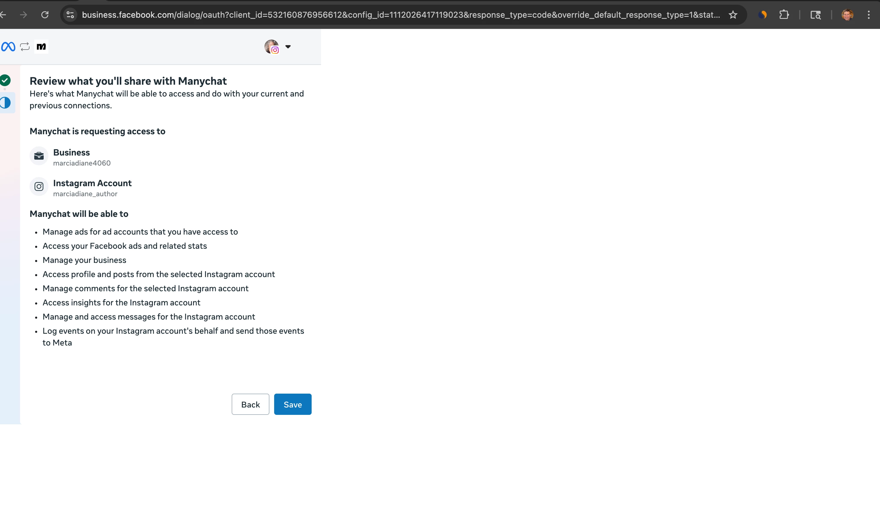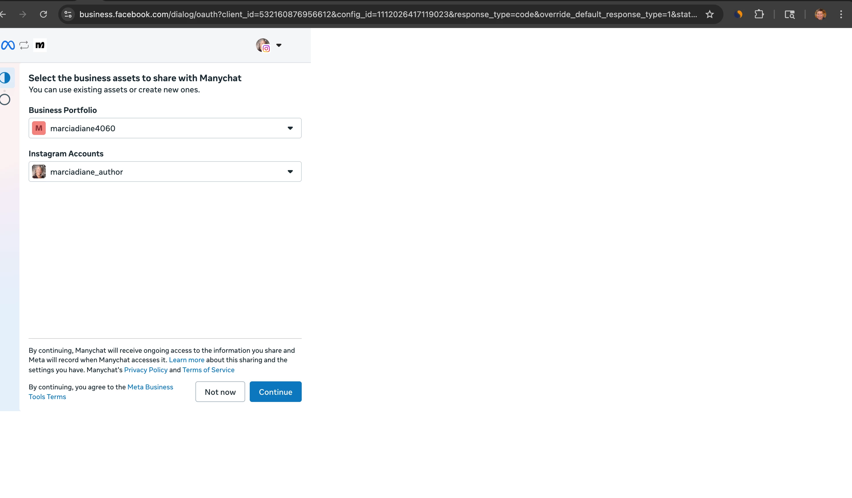 I accept marciadiane4060 as the Business Portfolio and marciadiane_author as the Instagram Profile and click Continue.