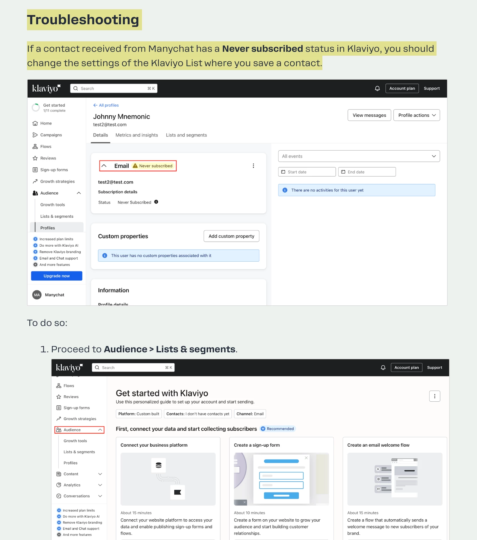 How do I subscribe profile to Opt In Email Marketing in Klaviyo? I've tried using the Klaviyo Action, creating webhooks, and nothing is working. Profile in Klaviyo does import and is added to a list but it says "Email Never subscribed". Please help!