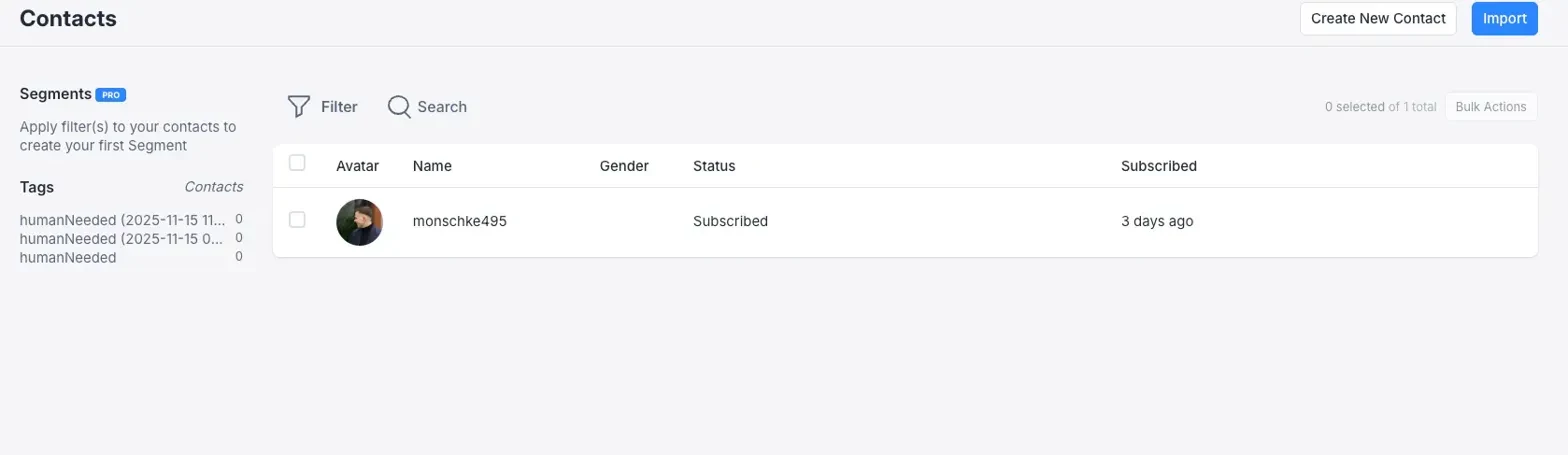 - Contacts page showing "monschke495" is subscribed and exists
