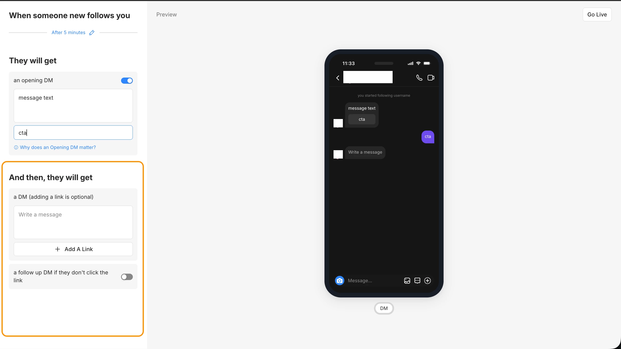 However, after the first welcome message is sent, it seems the only option available is to add a link (screenshot)