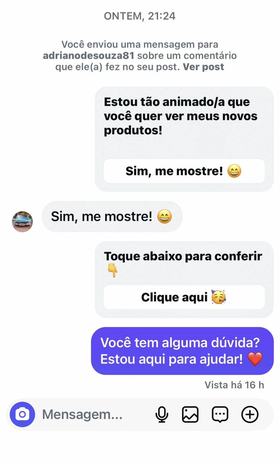 “Estou tão animado/a que você quer ver meus novos produtos!” com o botão “Sim, me mostre”