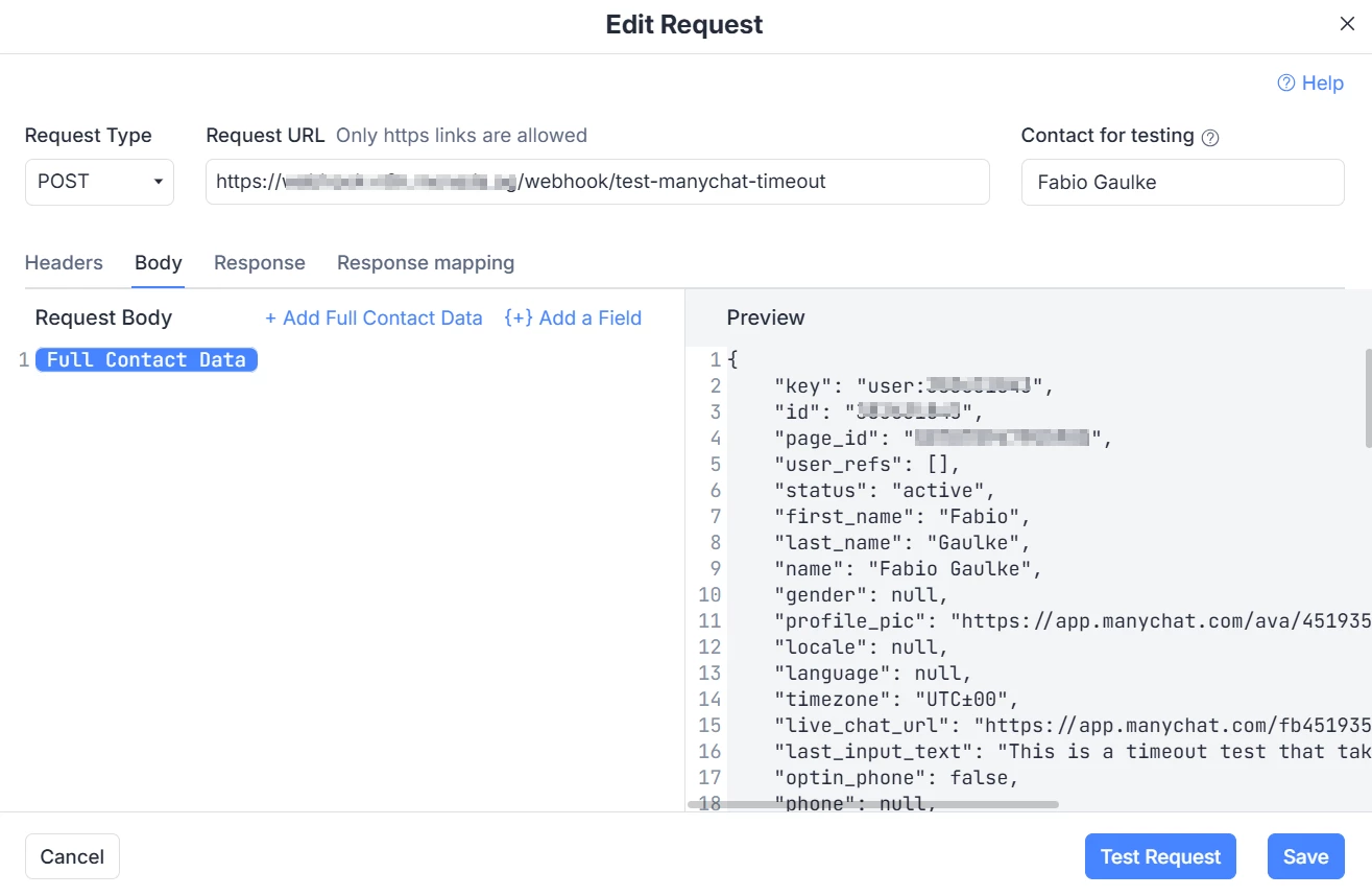 In the request, you can simply insert the Full Contact Data and send it to n8n or build yout JSON with just the fields you wish: PS: you must also send the subscriber ID to be able to set the response field and start the second automation.