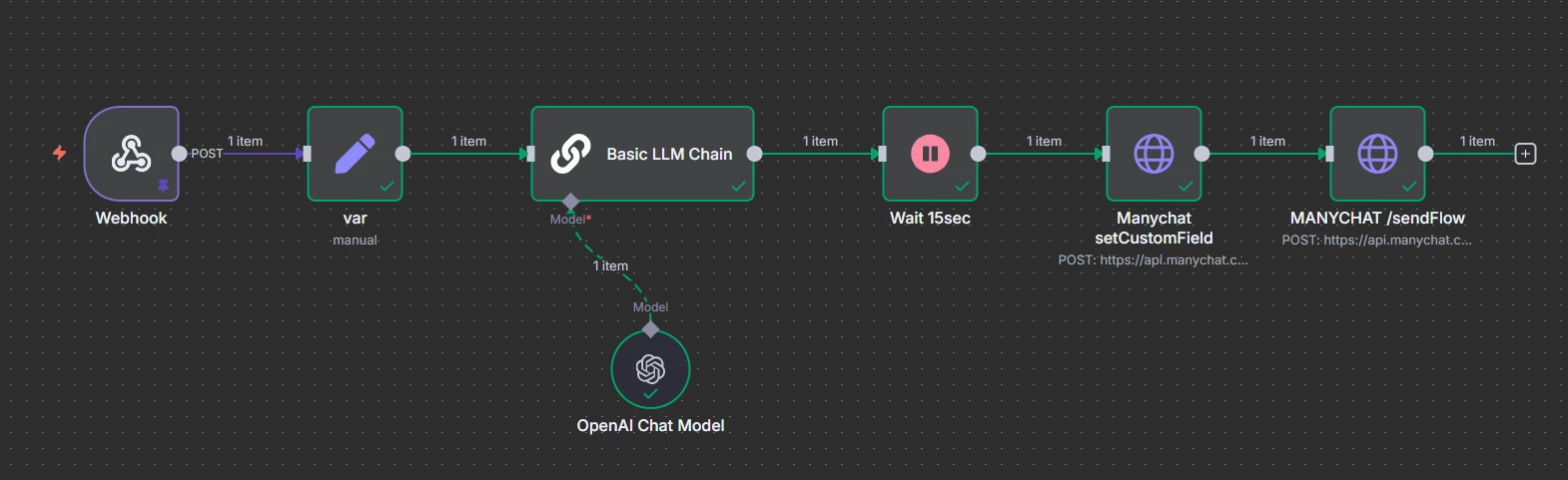 It is also important to remember that Manychat has a 10sec timeout for external requests. So keep an eye on your n8n automation processing time to stay under that time. If it takes more than 10sec to respond, you have to use Manychat's API to set the custom field value asynchronously and set the smart delay to more time.