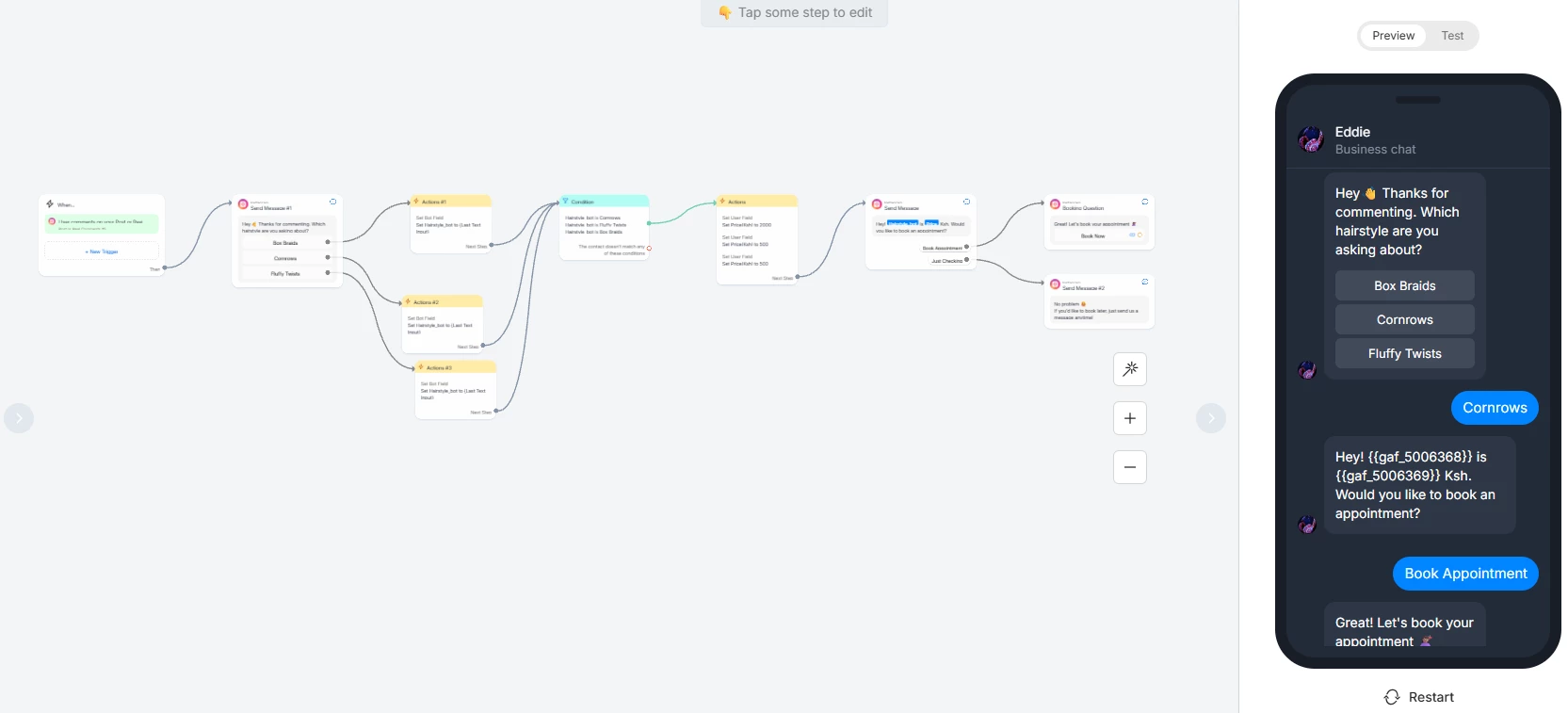 In my preview, the workflow reaches the message that says: “Hey! {{gaf_5006368}} is {{gaf_5006369}} Ksh. Would you like to book an appointment?” but the field values are not populating. Instead of showing the actual hairstyle and price, the preview is displaying the raw field placeholders. I believe the fields are bot fields, and the actual field names are hairstyle_bot field and Price, so I need help figuring out why the preview is not replacing those placeholders with the correct values and how to make the workflow populate them properly.