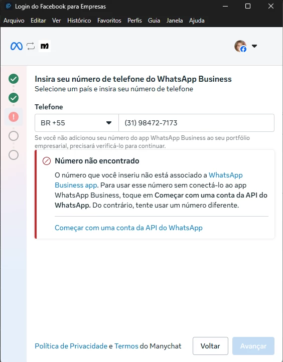 Não estou conseguindo conectar meu numero ao meta pelo manychat, já foi verificado pelo suporte do meta e está tudo correto, mas como mostra a imagem não conecta