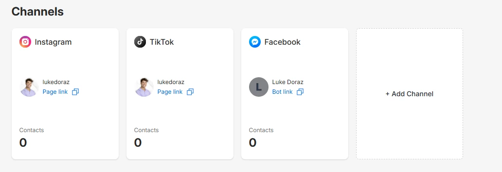 — My Instagram (@lukedoraz) and TikTok (@lukedoraz) channels are connected correctly in ManyChat, showing my proper profile picture and page links.