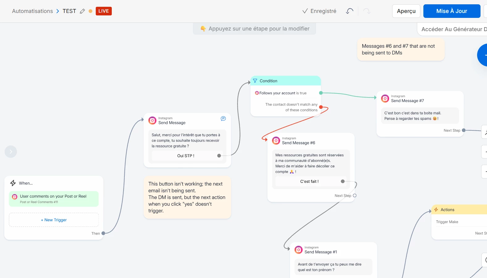 Hello everyone, Okay, I think I know where my problem lies. I'm stuck after my button on the first "send message" block. Even when I click the button in a DM, the rest of the process doesn't trigger. I've attached an image of my workflow. Thanks everyone for your help ! Alexandre