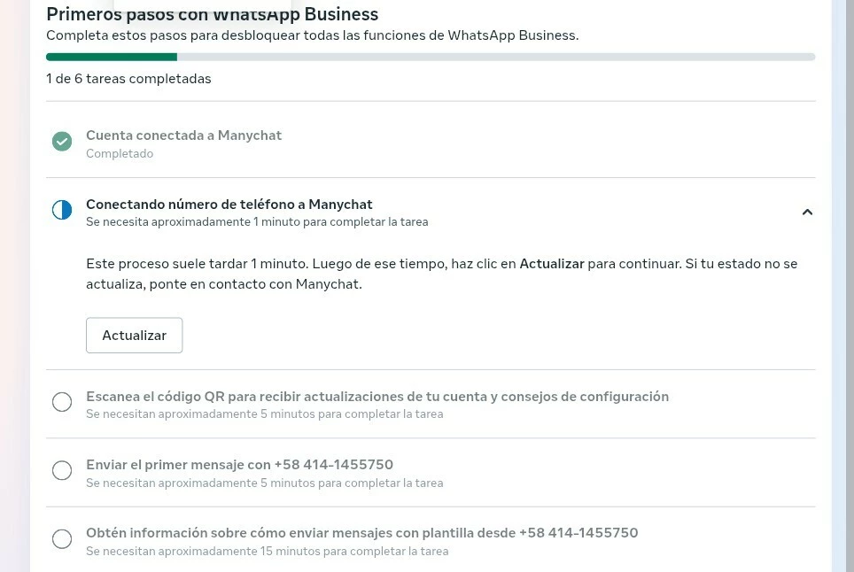Creo que hice todos los pasos bien al vincular un número nuevo al API pero me sale un mensaje de felicidades tu cuenta de conectó a manychat pero me dice en un plazo de 24 horas revisaremos que cumples con nuestros parámetros y de allí no avanza, en el meta business suite dice el número en estatus pendiente, que puedo hacer para solucionar?