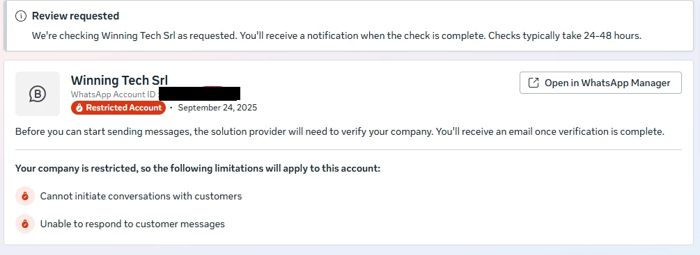 as you can see on the image, our account is under restriction becouse meta says that before we can start sending messages, the solution provider (Manychat) will need to verify our company.