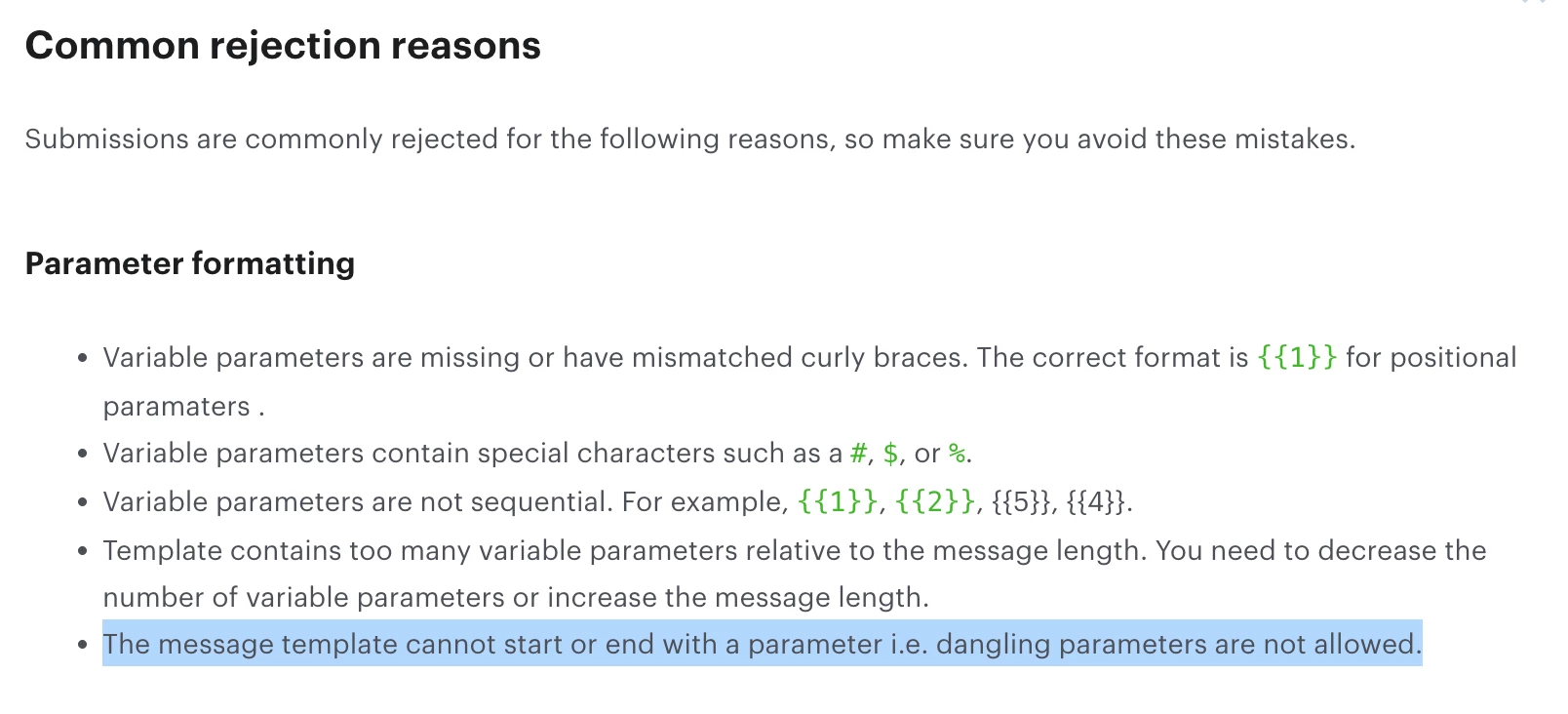 I’ve been having recurring issues with message templates not getting approved whenever I use the "First Name" variable (especially when it’s the first word in the message). When I submit it for approval, an error message appears — but it doesn’t specify what the actual issue is.