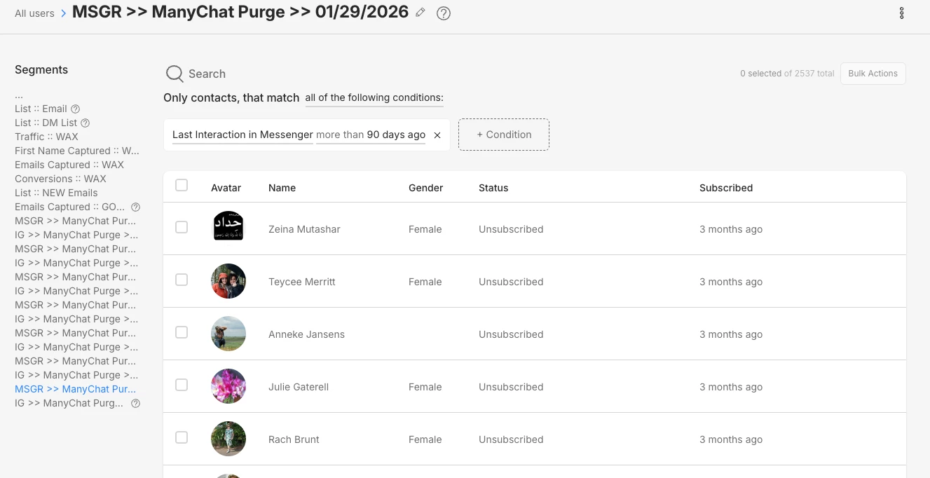 I followed the instructions in “Remove Contacts To Reduce Your Monthly ManyChat Cost Initially” from the School of Bots guide (purging unengaged contacts older than 90+ days for both Messenger and Instagram).