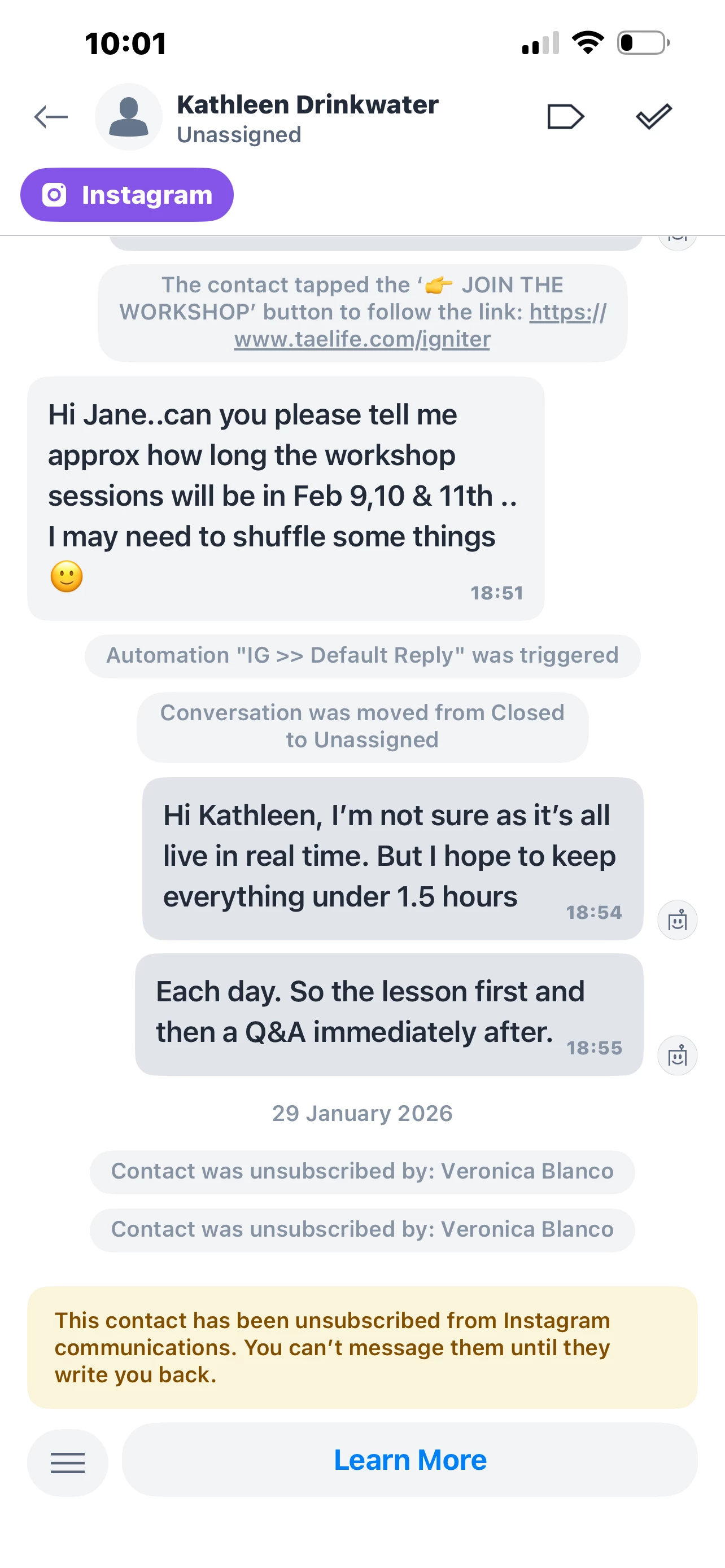 However, I’m now noticing that some conversations from just a few days ago are showing as unsubscribed, which means we can’t message them back.