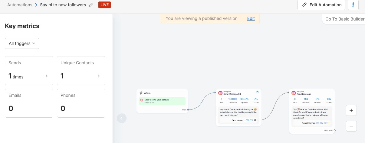 Hi there, I set up the ‘say hi to new followers’ automation where they get a freebie sent to them if they click yes. However it has only sent to one person and I have had about 200 new followers this week.. numbers don’t add up. I’m not sure why because it looks like everything is set up and no error messages? Any advice?