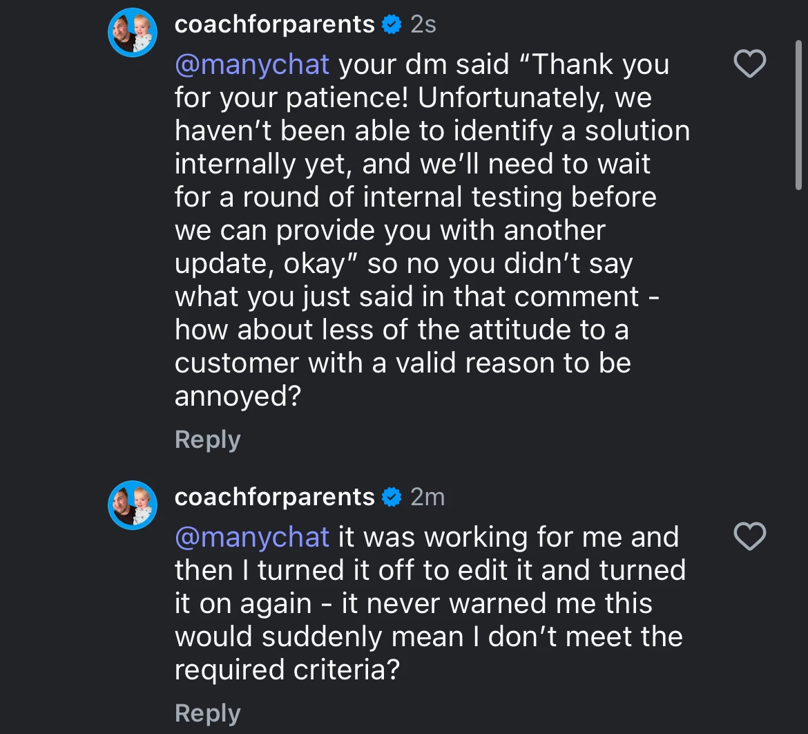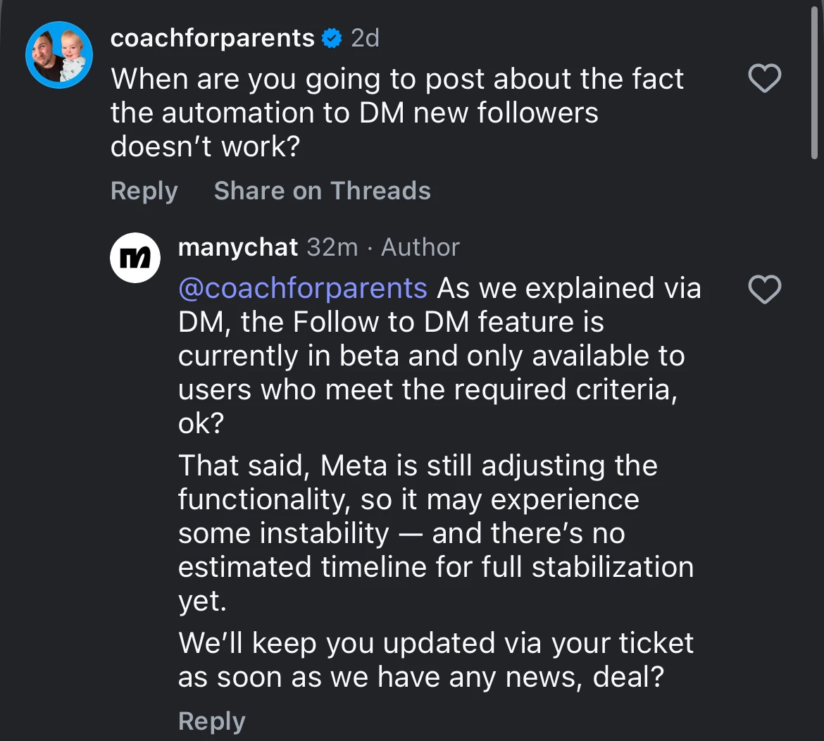 “We want to let you know that the issue affecting the Instagram “Say hi to new followers” automation has been identified as a Meta-side bug and is currently under active investigation.