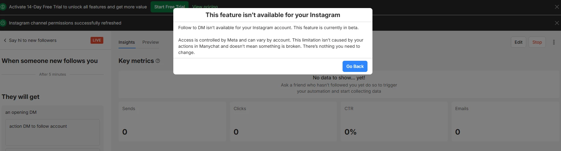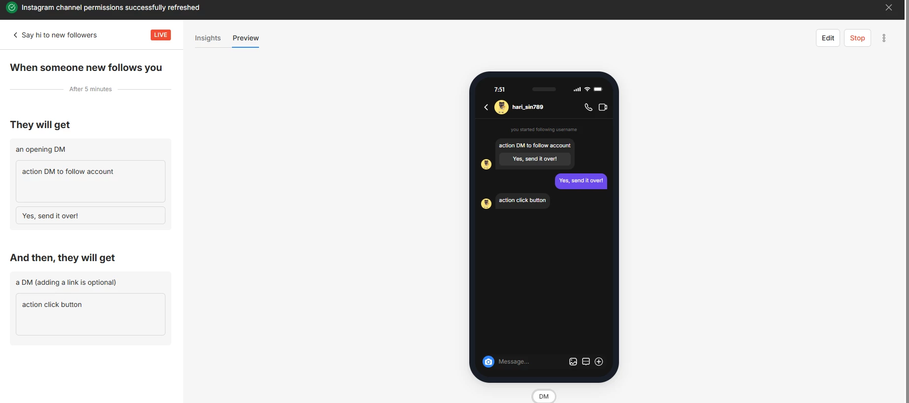 I would like to report an issue with the “Send message when a new user follows the Instagram account” feature.