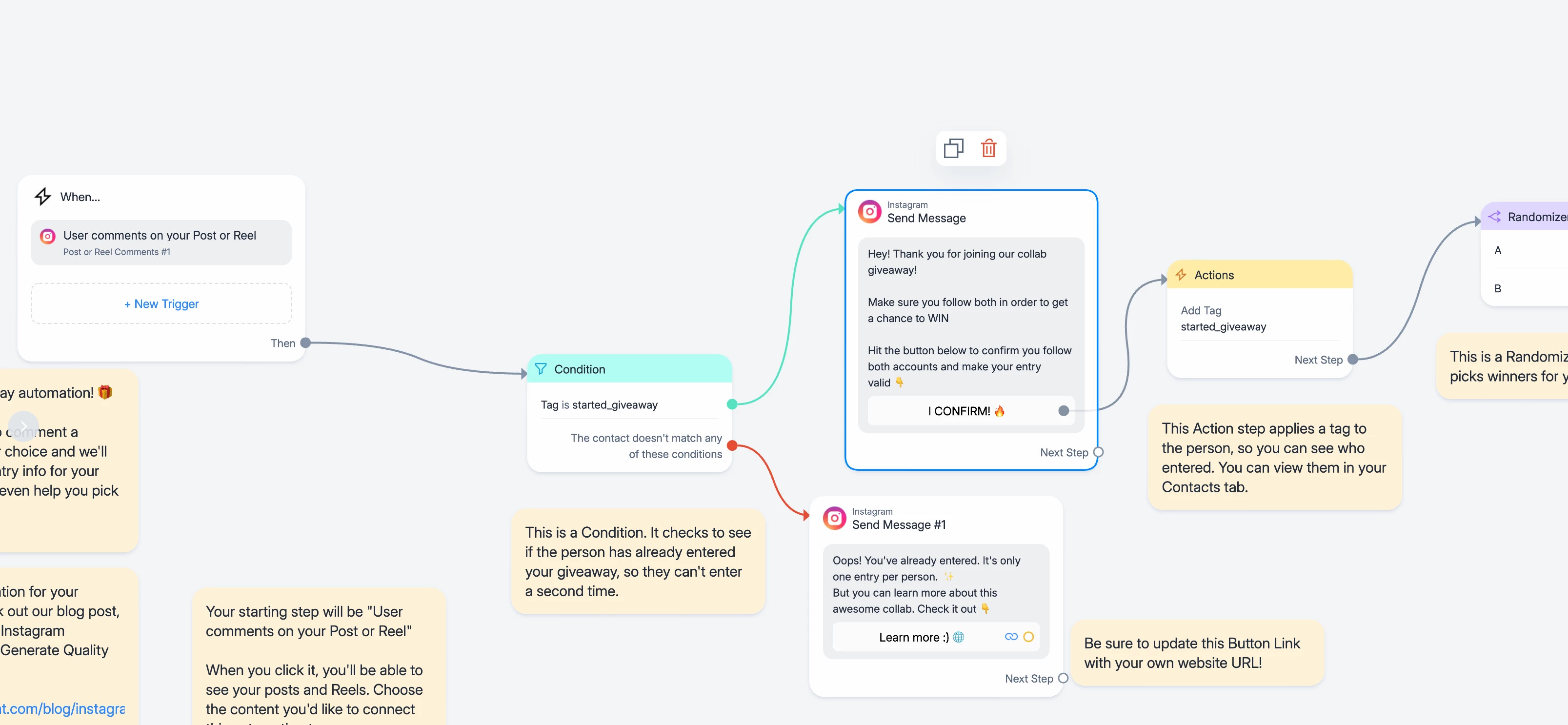 So to me on the condition module it should be set to TAG is NOT “started_giveaway” so new entrants would go the green way YES and people who are tagged with “started_giveaway” would be NO and get a different message.