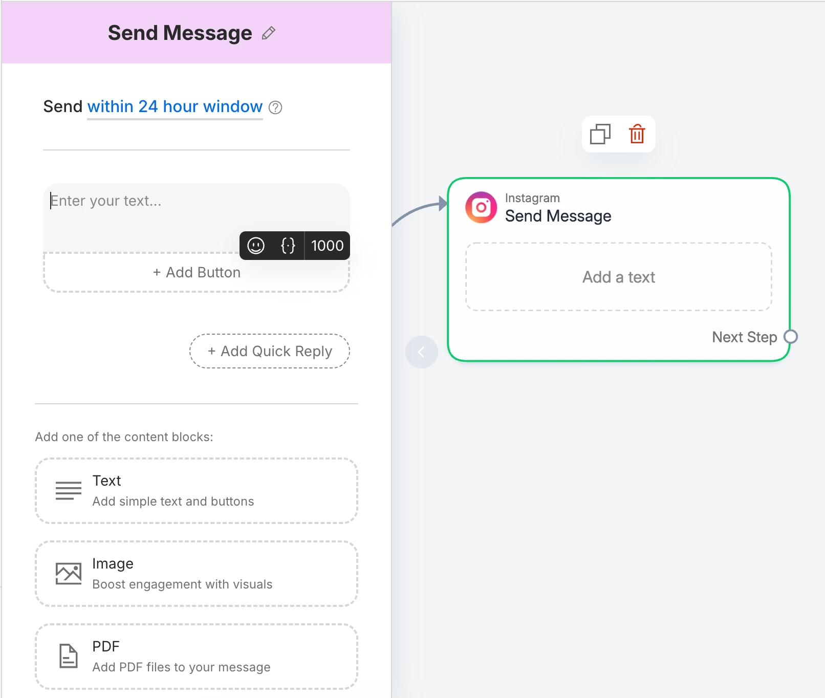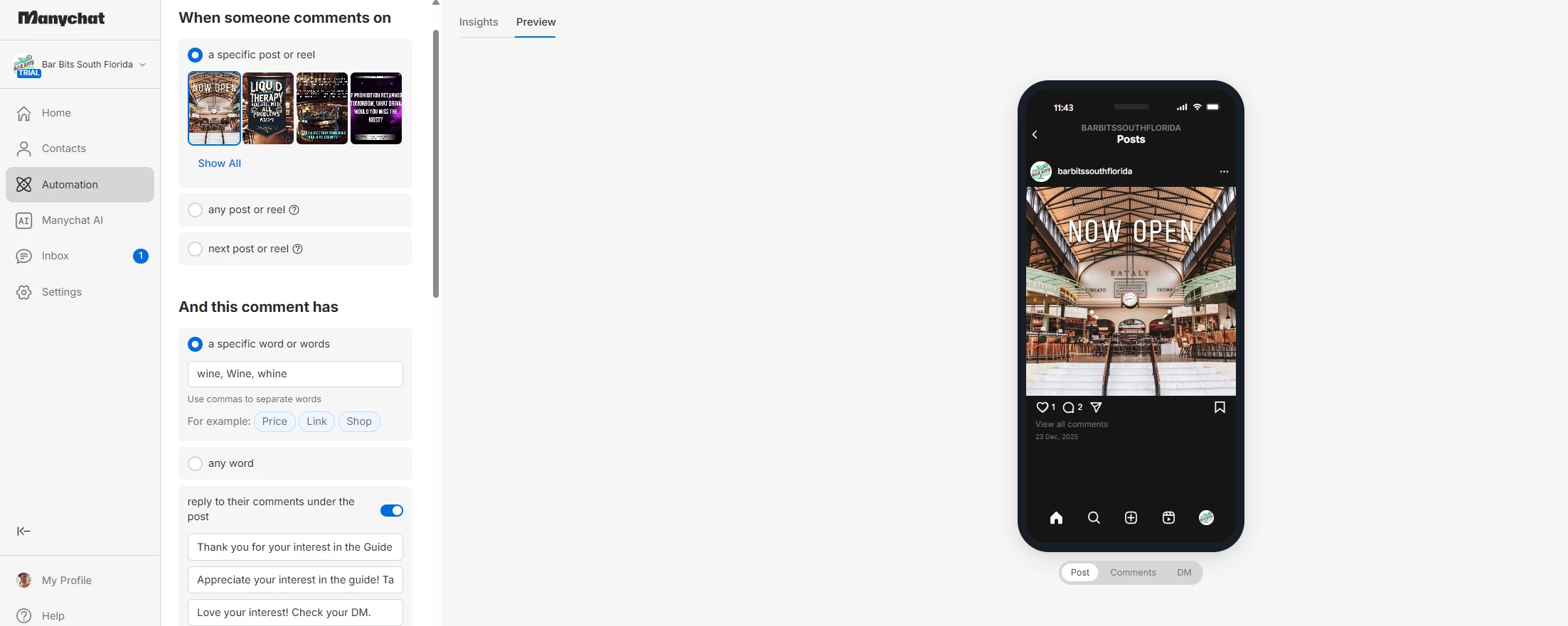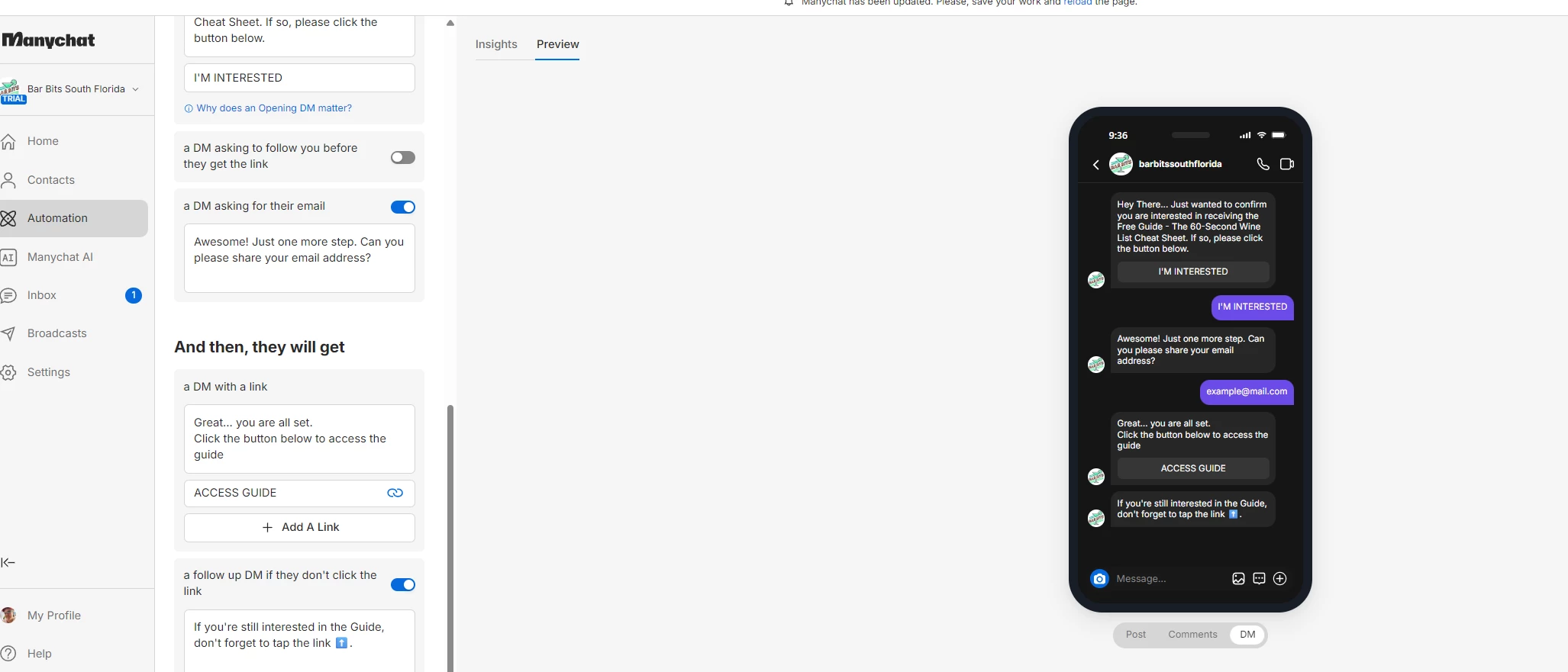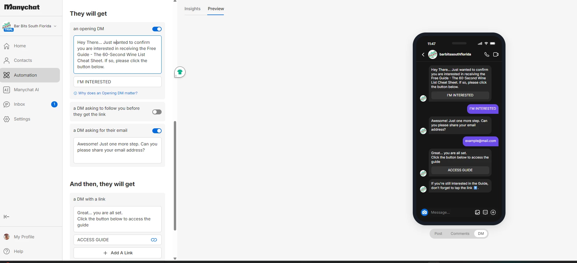 On particular IG posts, in the description, I will be asking users to Comment “Wine” in order to receive a Free PDF guide. In addition, I will be telling them to follow me on Instagram first, so I can DM them. IG won't deliver the DM if they are not following. Once the users follow my page, ManyChat will automatically respond to these comments with a line that says something like, “Sending over my Free Guide now. Please check your DM”