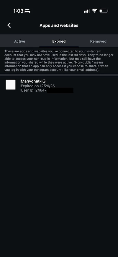 In Instagram Accounts Center → Apps and websites, I see “Manychat-IG — Expired on 12/26/25.” After multiple reconnect attempts it still shows as Expired.