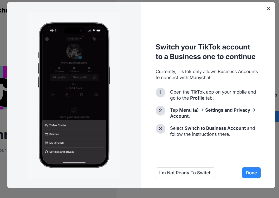 I have tried a dozen times now to connect my business TikTok account to ManyChat. It keeps telling my that my account isn’t a business account and gives me a message to switch it, even though it is a business account. 1) I have a business account, 2) I have reviewed and confirmed all the info provided.