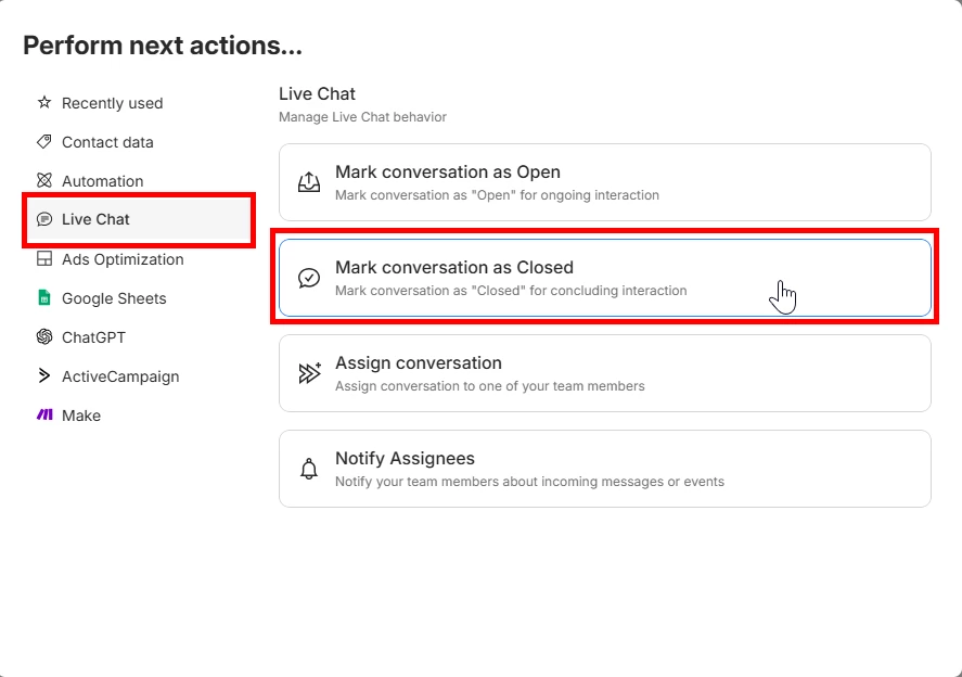 Currently, I don’t see any trigger like “Conversation status changed to closed”.