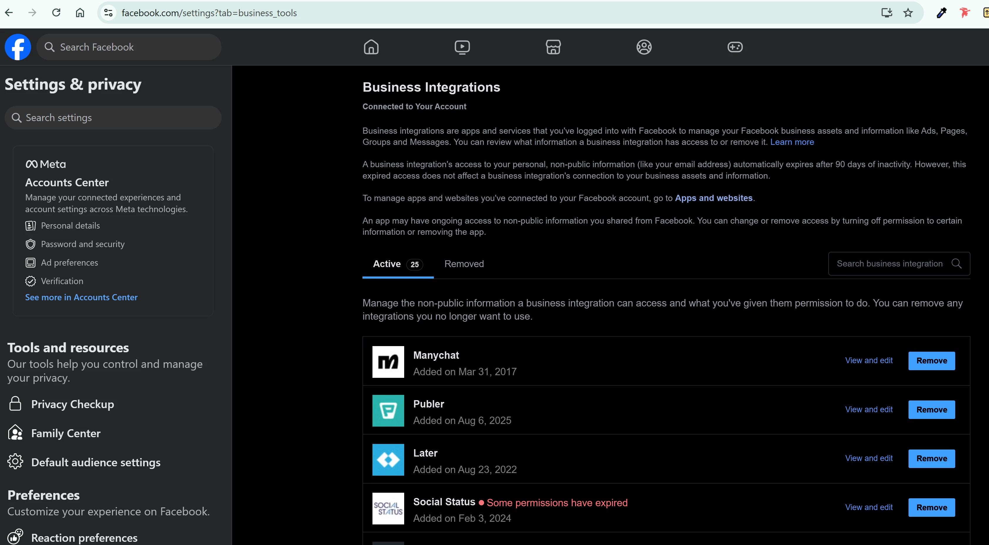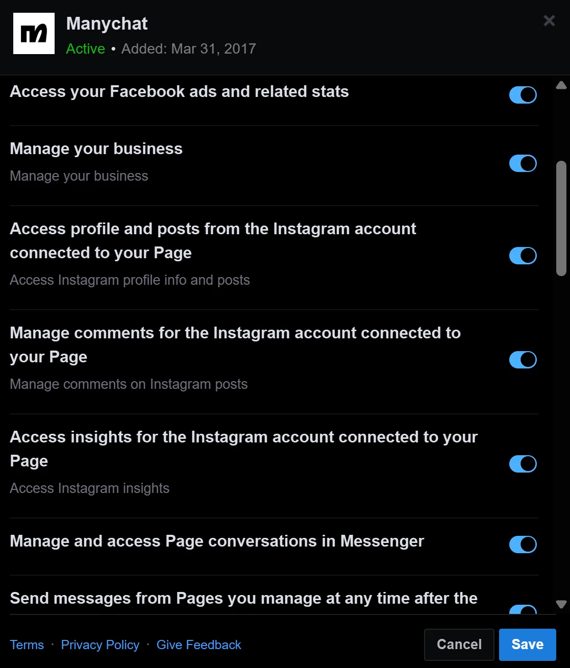 What i found is that this looks like a Meta issue. Manychat permissions run at the user level. For instance my personal Facebook account settings effect all the pages I own. Even if my business portfolio has “partner access” the new Manychat features are using the Meta API. You can see it in image 1. These are my global settings. Even when I switch to a page I own, these settings disappear. The same happens when I try a clients page. So whoever has the main permissions or is also business manager admin may be able to go to this business tools and update permissions within manychat provided it’s connected. Will try with client tomorrow and report back.