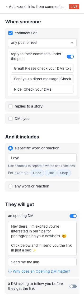 I’m trying to set up an automated DM based on a comment on a post. Seems like this should be straightforward, but it doesn’t seem to work. I started this using the Auto-DM links from comments card on the homepage. I’ve set the automation to reply to a comment whenever someone comments Love. Then, it should send them an opening DM, ask for their email, and send them a link to a PDF.