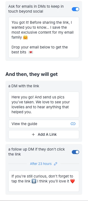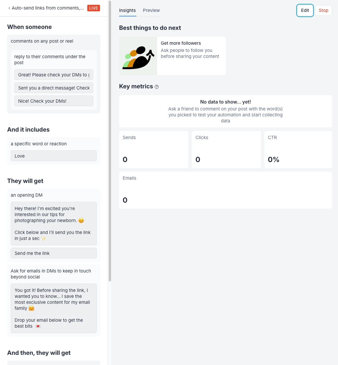 When I comment Love on the post though I don’t get a reply on the comment. I do get the opening DM, but when I click the send me the link button it seems to refresh the page, but doesn’t follow-up with the subsequent message that asks for my email address.