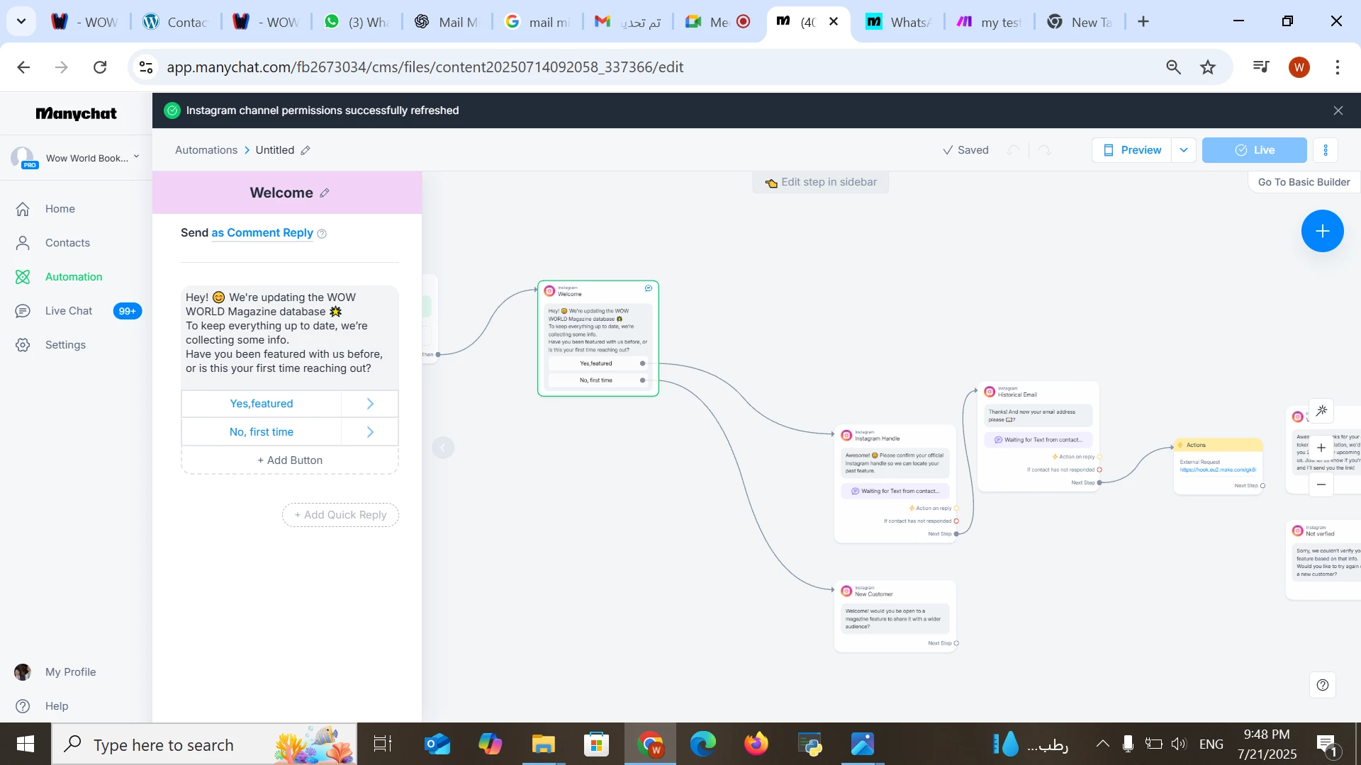 We’re currently testing Manychat to see whether it will meet our requirements, but we are encountering a few scenarios where the 24-hour messaging window is a challenge. For example: