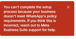 “You can't complete the setup process because your business doesn't meet WhatsApp's policy requirements…” (screenshot attached).