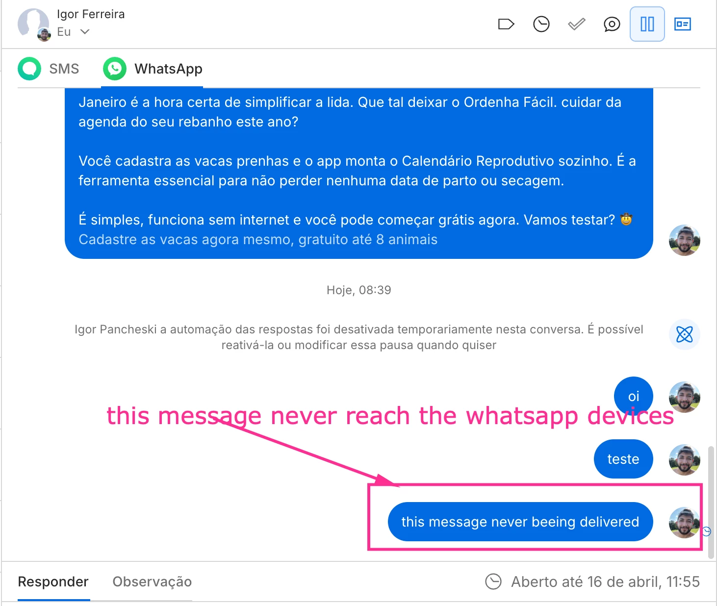 I was using the whatsapp for dispatch template messages, but suddently stop to work. even inside the inbox chat. i already tried reconfigure everything but no success. i need help to deliver messages.
