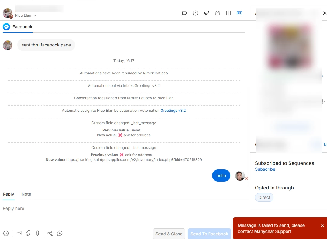 One of my customer messsage us on our facebook page but we can’t reply to them. I tried contacting support@manychat.com but I am getting an automated response only.