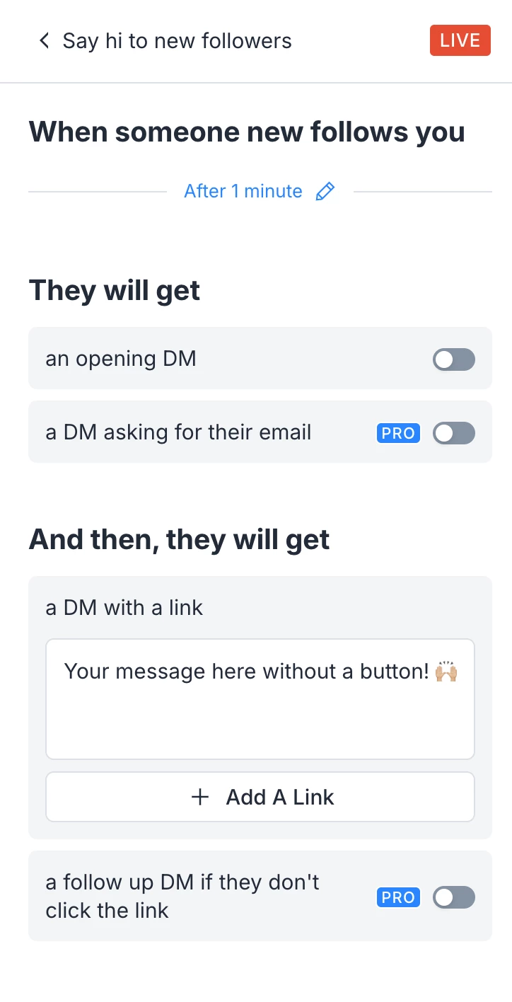 Note that using this automation this way, you can’t continue the conversation through Manychat because the message without a button doesn’t open the 24-hour window.